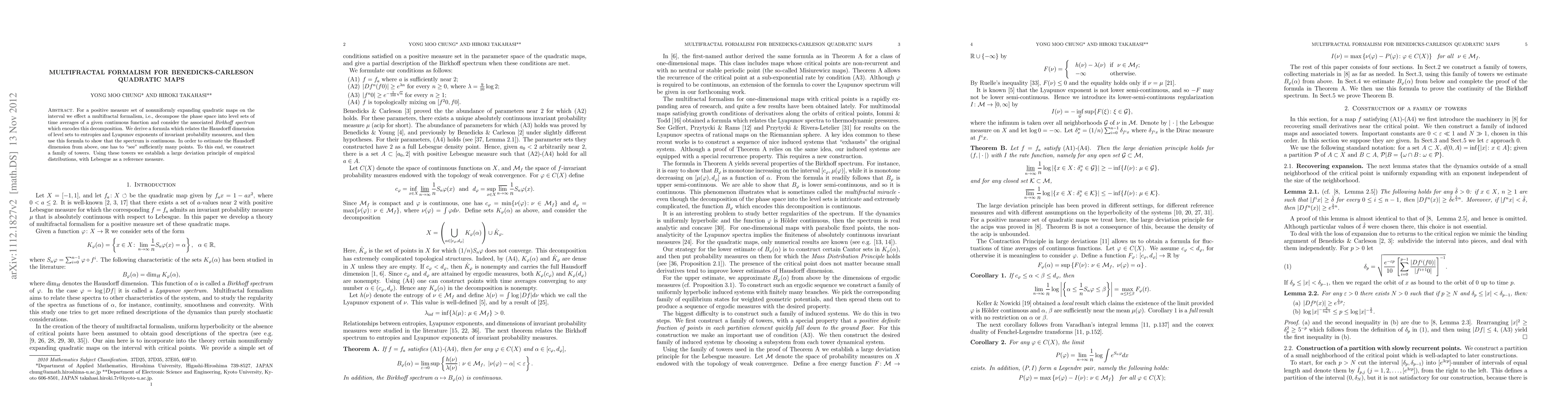 For a positive measure set of nonuniformly expanding quadratic maps on the interval we effect a multifractal formalism, i.e., decompose the phase space into level sets of time averages of a given observable and consider the associated {\it Birkhoff spectrum} which encodes this decomposition. We derive a formula which relates the Hausdorff dimension of level sets to entropies and Lyapunov exponents of invariant probability measures, and then use this formula to show that the spectrum is continuous. In order to estimate the Hausdorff dimension from above, one has to "see" sufficiently many points. To this end, we construct a family of towers. Using these towers we establish a large deviation principle for empirical distributions, with Lebesgue as a reference measure.