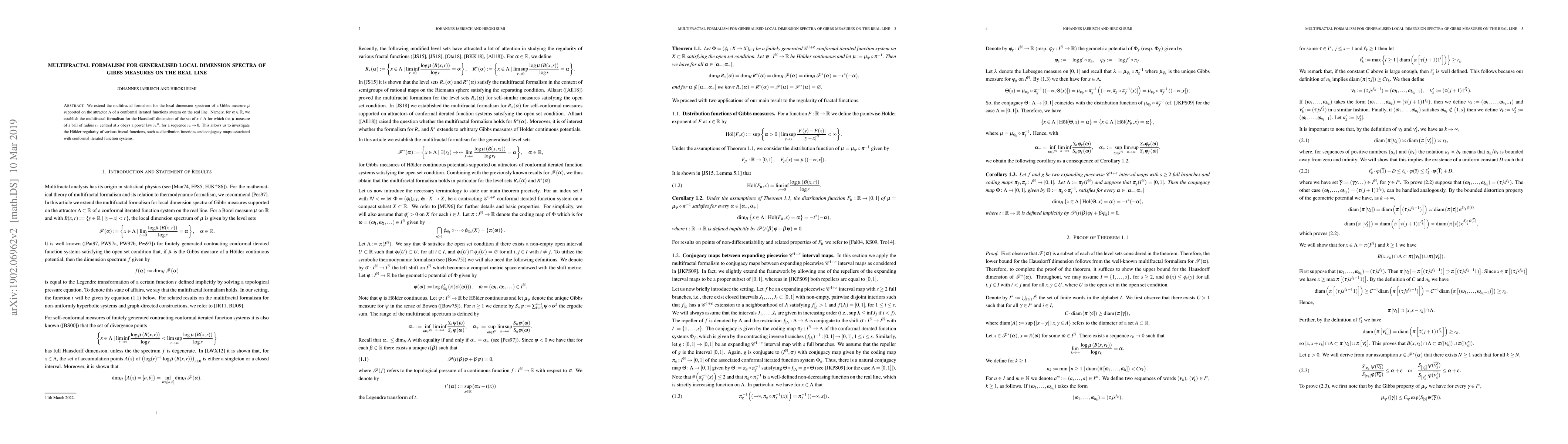 We refine the multifractal formalism for the local dimension of a Gibbs measure $\mu$ supported on the attractor $\Lambda$ of a conformal iterated functions system on the real line. Namely, for given $\alpha\in \mathbb{R}$, we establish the formalism for the Hausdorff dimension of level sets of points $x\in\Lambda$ for which the $\mu$-measure of a ball of radius $r_{n}$ centered at $x$ obeys a power law $r_{n}{}^{\alpha}$, for a sequence $r_{n}\rightarrow0$. This allows us to investigate the H\"older regularity of various fractal functions, such as distribution functions and conjugacy maps associated with conformal iterated function systems.