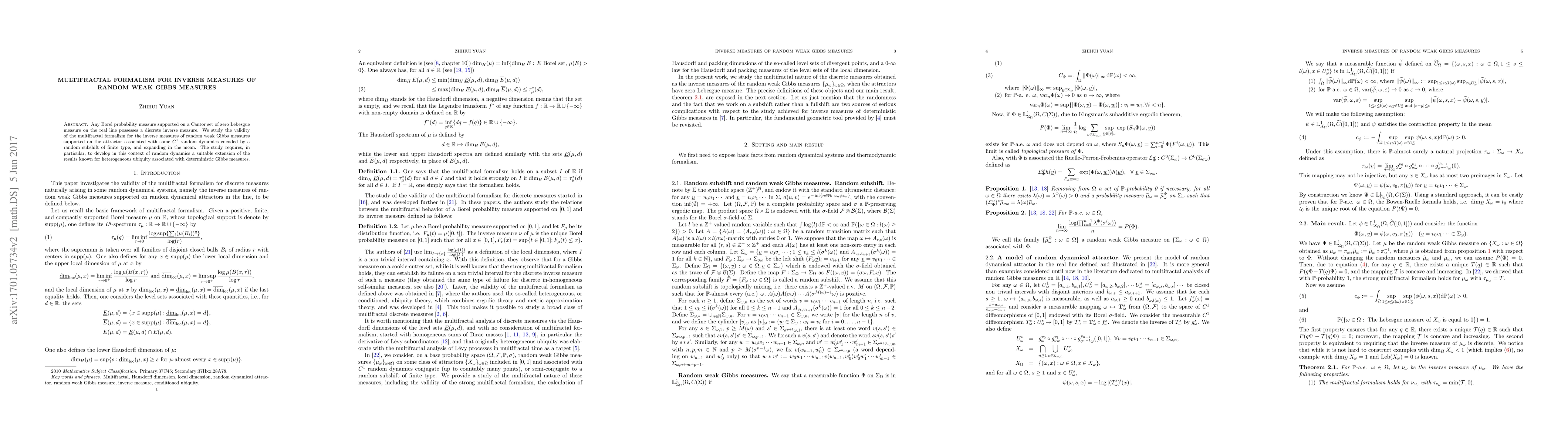 Any Borel probability measure supported on a Cantor set of zero Lebesgue measure on the real line possesses a discrete inverse measure. We study the validity of the multifractal formalism for the inverse measures of random weak Gibbs measures supported on the attractor associated with some $C^1$ random dynamics encoded by a random subshift of finite type, and expanding in the mean. The study requires, in particular, to develop in this context of random dynamics a suitable extension of the results known for heterogeneous ubiquity associated with deterministic Gibbs measures.