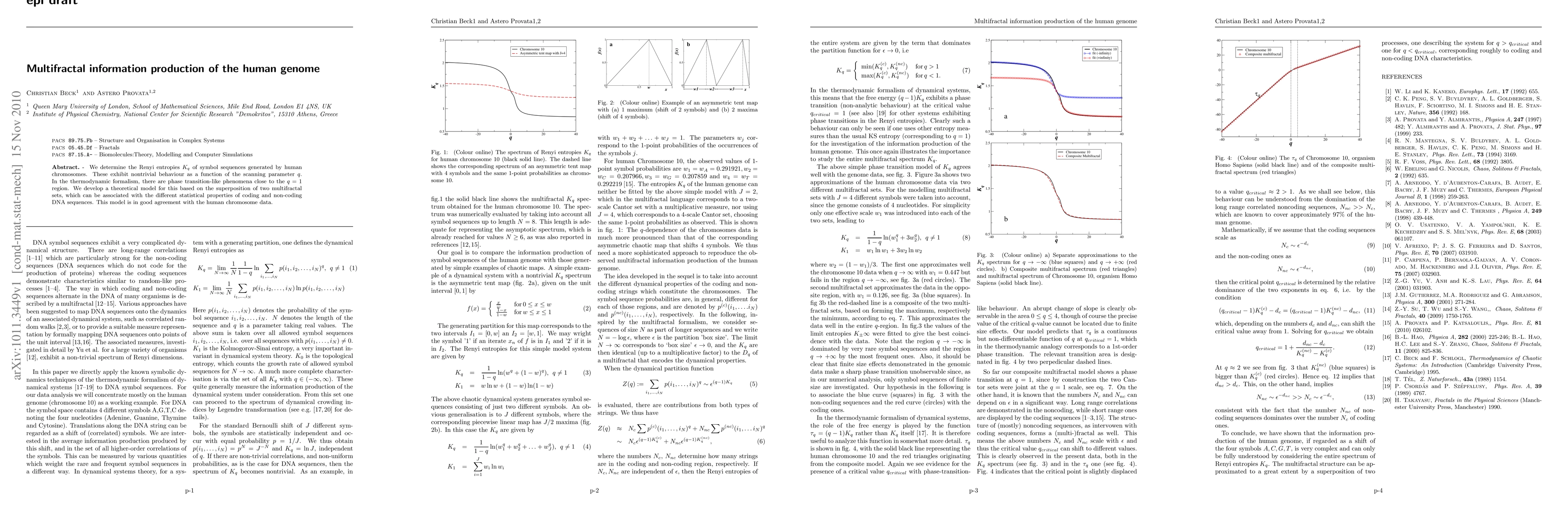 We determine the Renyi entropies K_q of symbol sequences generated by human chromosomes. These exhibit nontrivial behaviour as a function of the scanning parameter q. In the thermodynamic formalism, there are phase transition-like phenomena close to the q=1 region. We develop a theoretical model for this based on the superposition of two multifractal sets, which can be associated with the different statistical properties of coding and non-coding DNA sequences. This model is in good agreement with the human chromosome data.