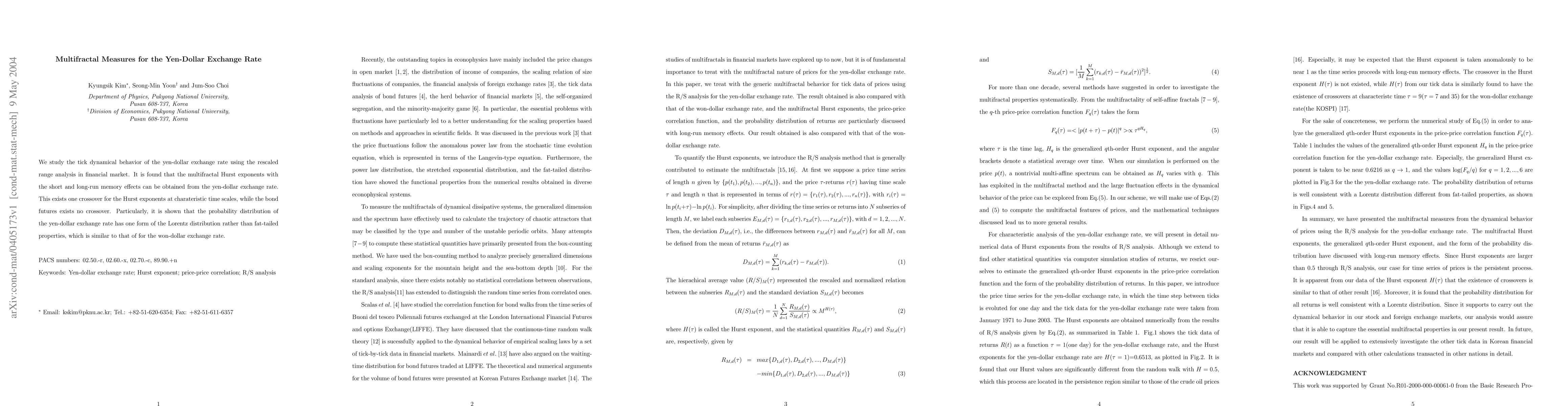 We study the tick dynamical behavior of the yen-dollar exchange rate using the rescaled range analysis in financial market. It is found that the multifractal Hurst exponents with the short and long-run memory effects can be obtained from the yen-dollar exchange rate. This exists one crossover for the Hurst exponents at charateristic time scales, while the bond futures exists no crossover. Particularly, it is shown that the probability distribution of the yen-dollar exchange rate has one form of the Lorentz distribution rather than fat-tailed properties, which is similar to that of for the won-dollar exchange rate.