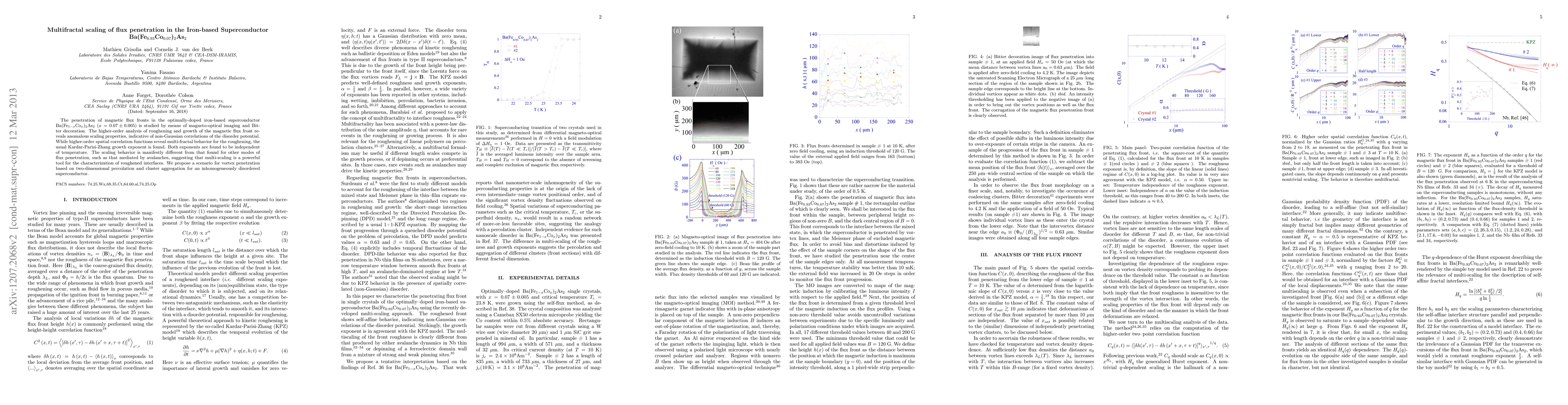 The penetration of magnetic flux fronts in the optimally-doped iron-based superconductor Ba(Fe$_{1-x}$Co$_{x}$)$_{2}$As$_2$ ($x = 0.07 \pm 0.005$) is studied by means of magneto-optical imaging and Bitter decoration. The higher-order analysis of roughening and growth of the magnetic flux front reveals anomalous scaling properties, indicative of non-Gaussian correlations of the disorder potential. While higher-order spatial correlation functions reveal multi-fractal behavior for the roughening, the usual Kardar-Parisi-Zhang growth exponent is found. Both exponents are found to be independent of temperature. The scaling behavior is manifestly different from that found for other modes of flux penetration, such as that mediated by avalanches, suggesting that multi-scaling is a powerful tool for the characterization of roughened interfaces. We propose a scenario for vortex penetration based on two-dimensional percolation and cluster aggregation for an inhomogeneously disordered superconductor.