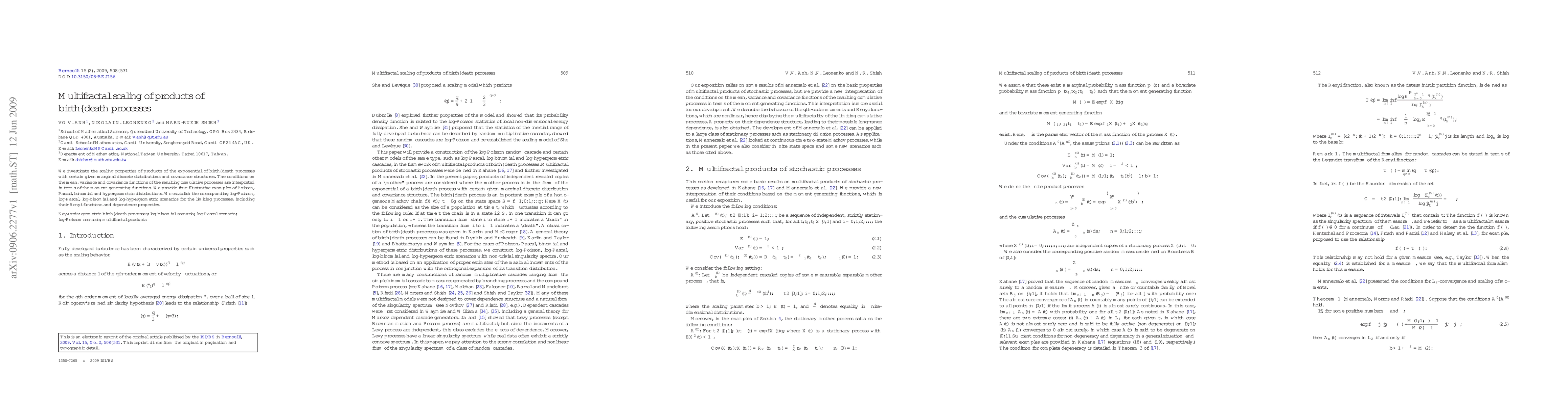 The paper presents detailed conditions for multifractal scaling of products of birth-death processes and provides rigorous mathematical proofs for convergence and asymptotic behaviors.