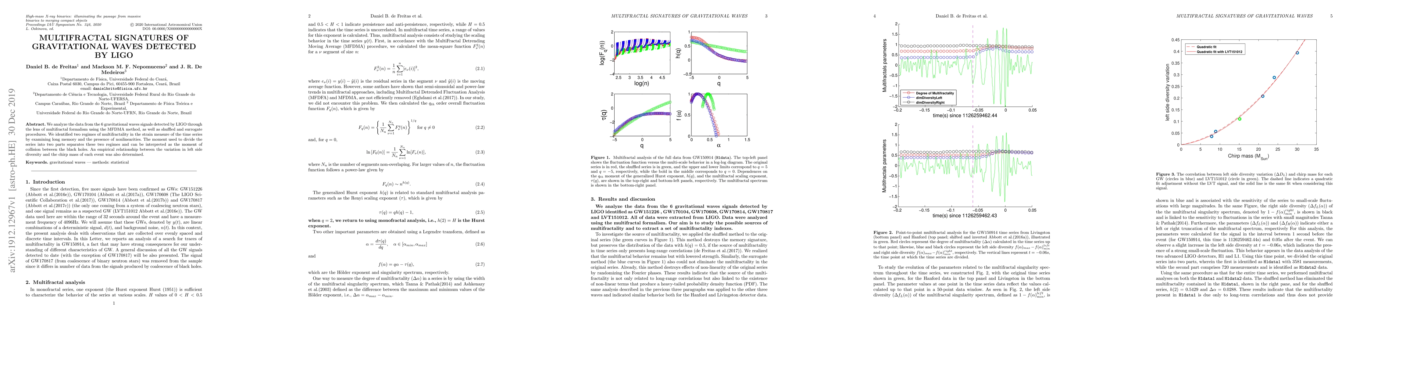 We analyze the data from the 6 gravitational waves signals detected by LIGO through the lens of multifractal formalism using the MFDMA method, as well as shuffled and surrogate procedures. We identified two regimes of multifractality in the strain measure of the time series by examining long memory and the presence of nonlinearities. The moment used to divide the series into two parts separates these two regimes and can be interpreted as the moment of collision between the black holes. An empirical relationship between the variation in left side diversity and the chirp mass of each event was also determined.