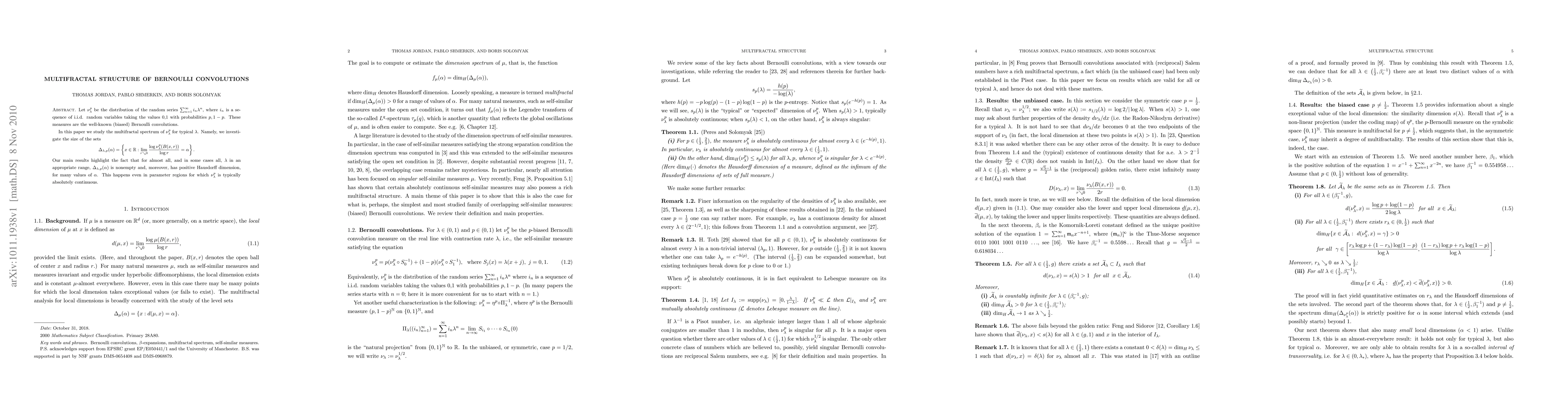 The paper investigates the multifractal structure of Bernoulli convolutions, finding that almost all lambda values in a certain range have nonempty sets with positive Hausdorff dimension for many alpha values.