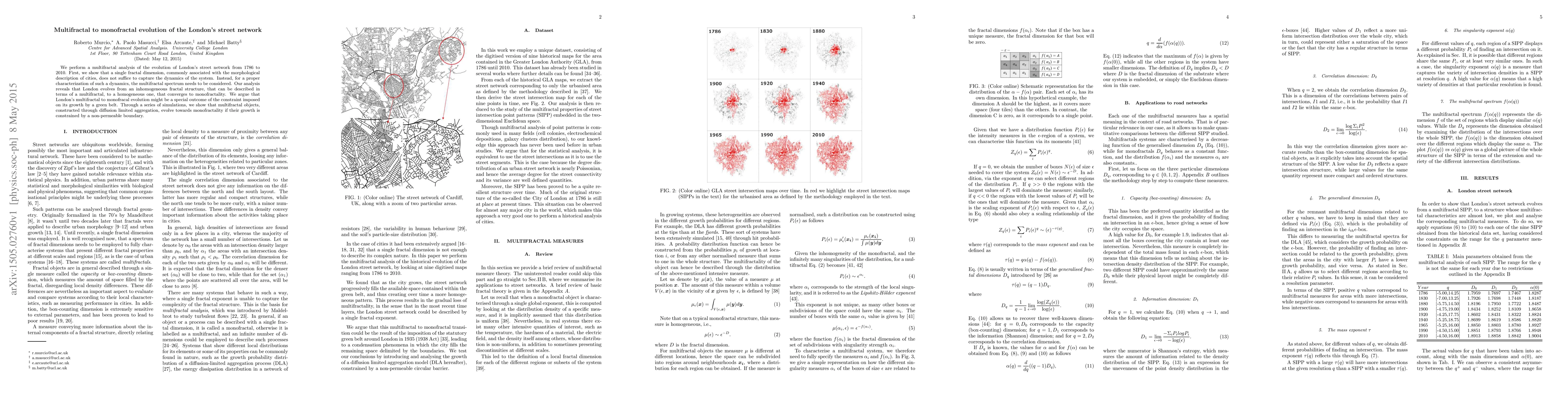 This paper analyzes the evolution of London's street network from 1786 to 2010 using multifractal analysis, revealing a transition from a complex multifractal structure to a simpler monofractal one. The study suggests that the growth constraint imposed by a green belt may have driven this transition.