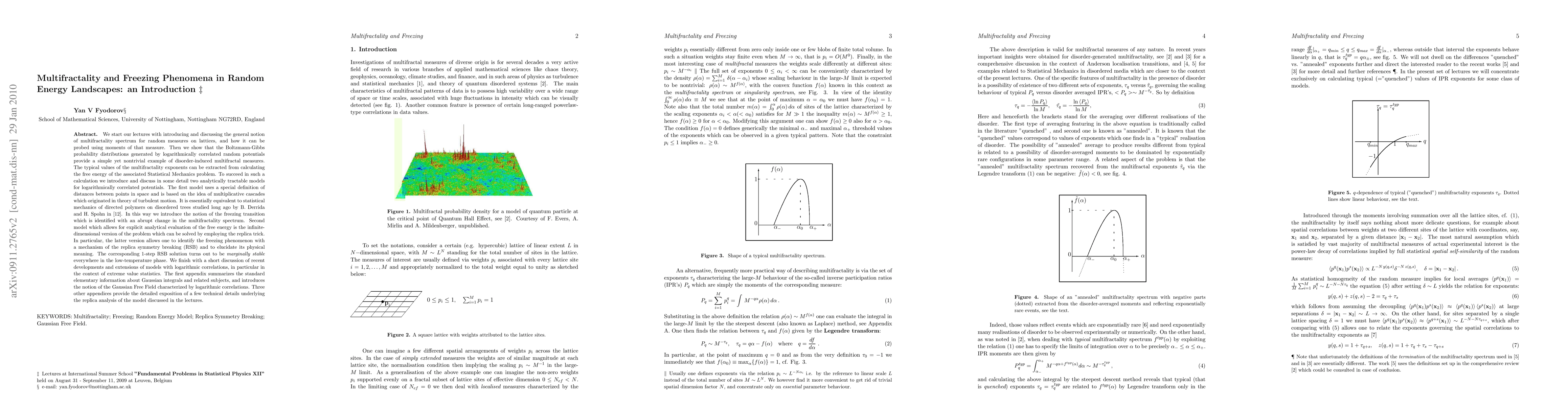 The Boltzmann-Gibbs probability distributions generated by logarithmically correlated random potentials provide a simple yet nontrivial example of disorder-induced multifractal measures. We introduce and discuss two analytically tractable models for such potentials. The first model uses multiplicative cascades and is equivalent to statistical mechanics of directed polymers on disordered trees studied long ago by B. Derrida and H. Spohn. Second model is the infinite-dimensional version of the problem in Euclidean space which can be solved by employing the replica trick. In particular, the latter version allows one to identify the freezing of multifractality exponents with a mechanism of the replica symmetry breaking (RSB) and to elucidate its physical meaning. The corresponding 1-step RSB solution turns out to be {\it marginally stable} everywhere in the low-temperature phase. In the end we put the model in a more general context by relating to the Gaussian Free Field and briefly discussing recent developments and extensions. The appendices provide a detailed exposition of the replica analysis of the model discussed in the lectures.
