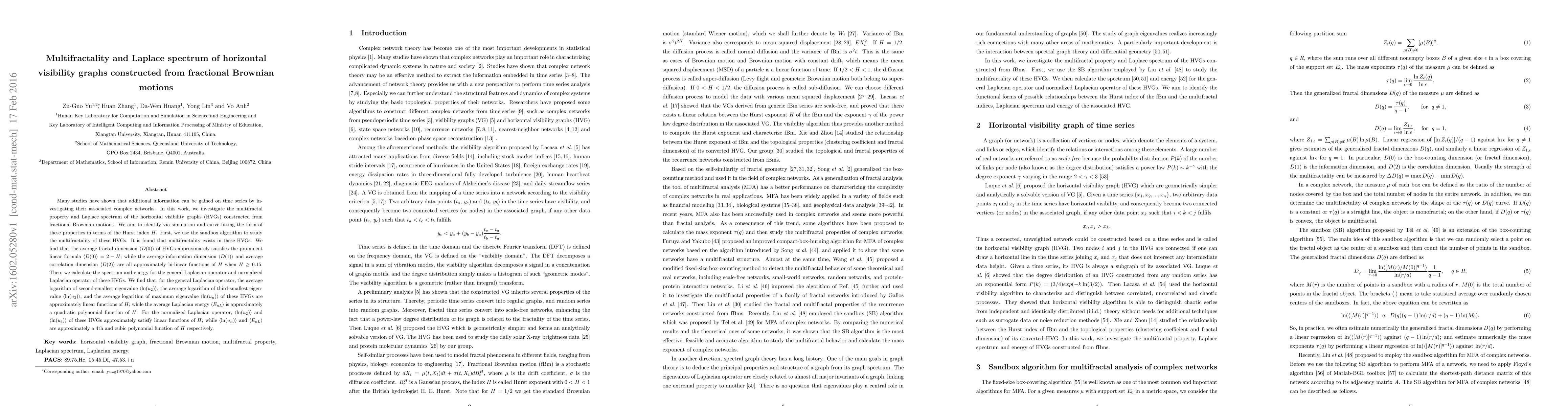 Many studies have shown that additional information can be gained on time series by investigating their associated complex networks. In this work, we investigate the multifractal property and Laplace spectrum of the horizontal visibility graphs (HVGs) constructed from fractional Brownian motions. We aim to identify via simulation and curve fitting the form of these properties in terms of the Hurst index $H$. First, we use the sandbox algorithm to study the multifractality of these HVGs. It is found that multifractality exists in these HVGs. We find that the average fractal dimension $\langle D(0)\rangle$ of HVGs approximately satisfies the prominent linear formula $\langle D(0)\rangle = 2 - H$; while the average information dimension $\langle D(1)\rangle$ and average correlation dimension $\langle D(2)\rangle$ are all approximately bi-linear functions of $H$ when $H\ge 0.15$. Then, we calculate the spectrum and energy for the general Laplacian operator and normalized Laplacian operator of these HVGs. We find that, for the general Laplacian operator, the average logarithm of second-smallest eigenvalue $\langle \ln (u_2) \rangle$, the average logarithm of third-smallest eigenvalue $\langle \ln (u_3) \rangle$, and the average logarithm of maximum eigenvalue $\langle \ln (u_n) \rangle$ of these HVGs are approximately linear functions of $H$; while the average Laplacian energy $\langle E_{nL} \rangle$ is approximately a quadratic polynomial function of $H$. For the normalized Laplacian operator, $\langle \ln (u_2) \rangle$ and $\langle \ln (u_3) \rangle$ of these HVGs approximately satisfy linear functions of $H$; while $\langle \ln (u_n) \rangle$ and $\langle E_{nL} \rangle$ are approximately a 4th and cubic polynomial function of $H$ respectively.