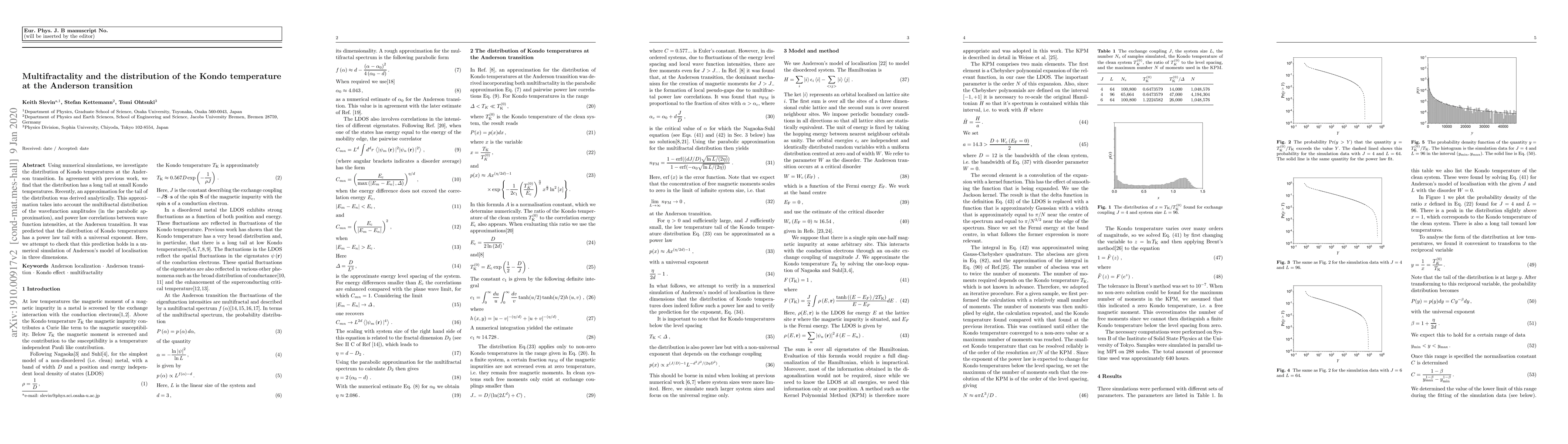 This paper uses numerical simulations to study the distribution of Kondo temperatures at the Anderson transition, confirming a long tail at small temperatures. It tests an analytical prediction of a power law tail with a universal exponent, derived from multifractal wavefunction amplitudes and power law correlations, in a three-dimensional Anderson localization model.