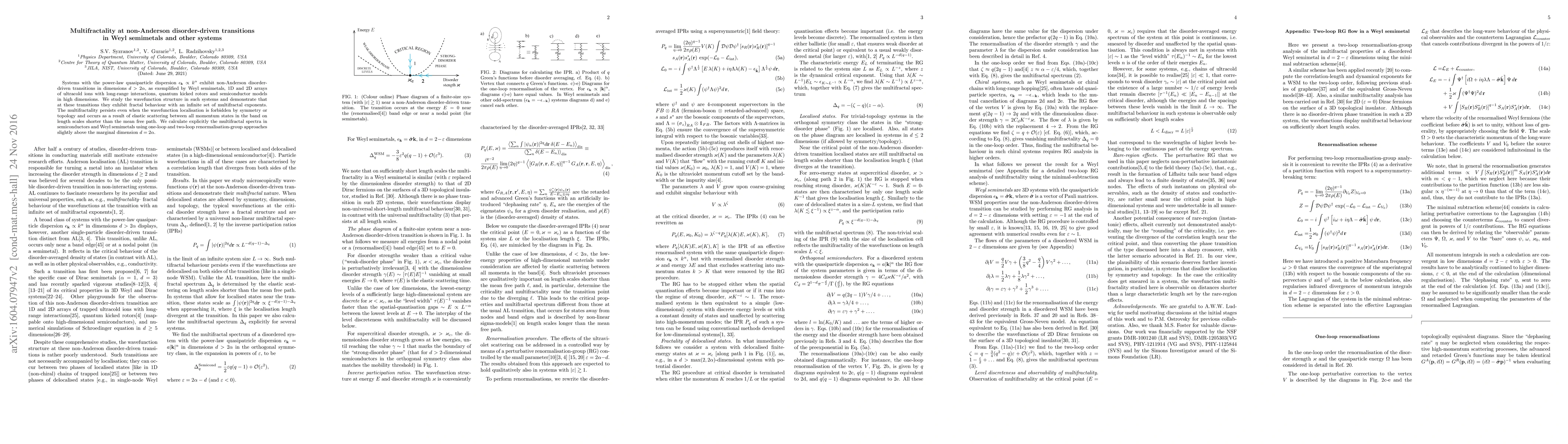 Systems with the power-law quasiparticle dispersion $\epsilon_{\bf k}\propto k^\alpha$ exhibit non-Anderson disorder-driven transitions in dimensions $d>2\alpha$, as exemplified by Weyl semimetals, 1D and 2D arrays of ultracold ions with long-range interactions, quantum kicked rotors and semiconductor models in high dimensions. We study the wavefunction structure in such systems and demonstrate that at these transitions they exhibit fractal behaviour with an infinite set of multifractal exponents. The multifractality persists even when the wavefunction localisation is forbidden by symmetry or topology and occurs as a result of elastic scattering between all momentum states in the band on length scales shorter than the mean free path. We calculate explicitly the multifractal spectra in semiconductors and Weyl semimetals using one-loop and two-loop renormalisation-group approaches slightly above the marginal dimension $d=2\alpha$.