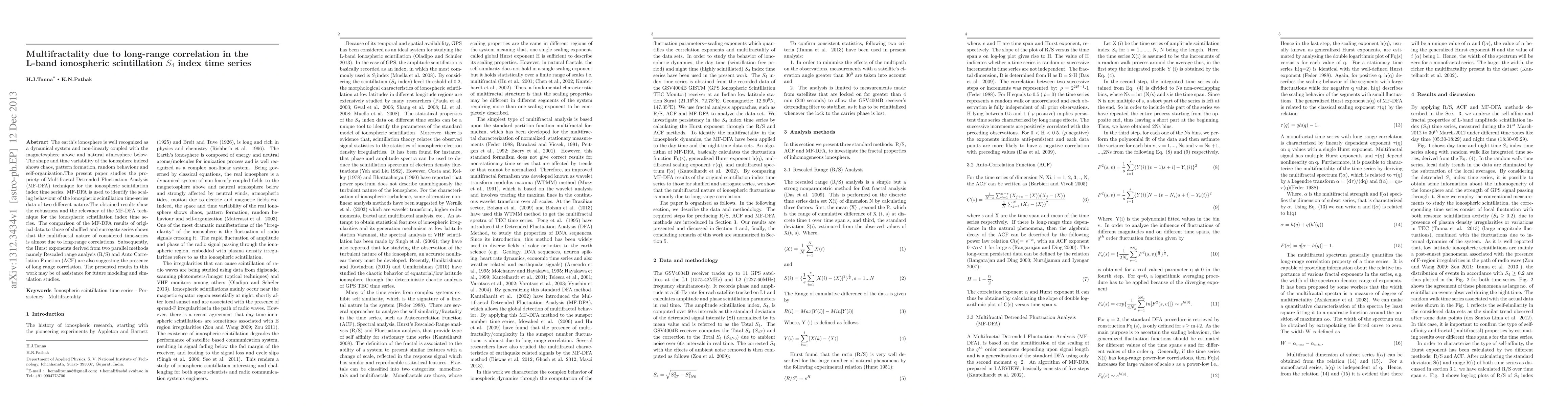 This paper employs the Multifractal Detrended Fluctuation Analysis (MF-DFA) technique to analyze the ionospheric scintillation S4 index time series, revealing its multifractal nature primarily due to long-range correlations. The study confirms the robustness of MF-DFA and highlights the presence of long-range correlations through comparisons with shuffled and surrogate series, as well as through Hurst exponent analysis.