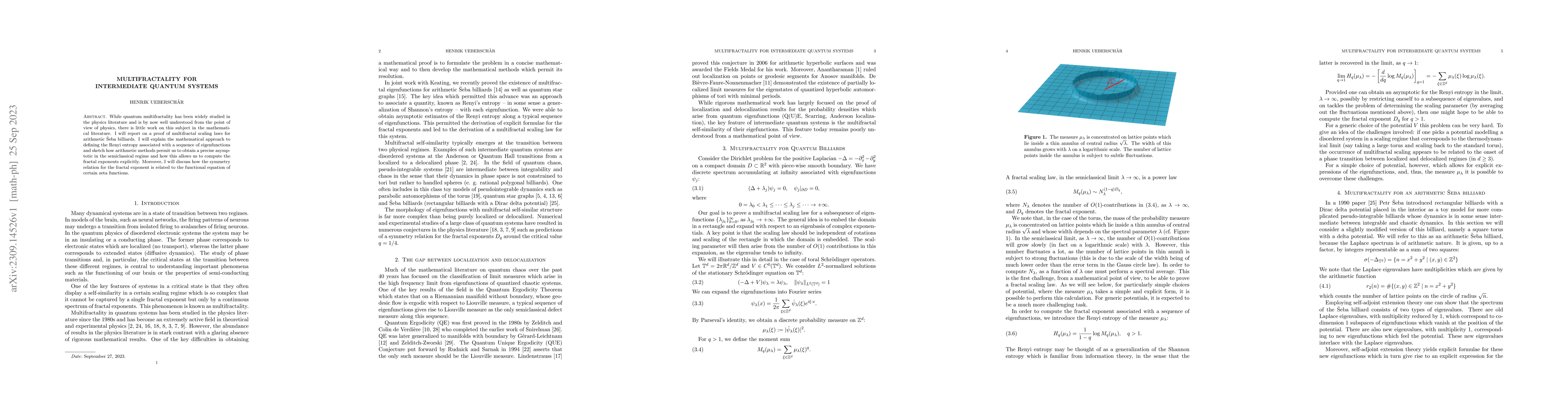 While quantum multifractality has been widely studied in the physics literature and is by now well understood from the point of view of physics, there is little work on this subject in the mathematical literature. I will report on a proof of multifractal scaling laws for arithmetic \u{S}eba billiards. I will explain the mathematical approach to defining the Renyi entropy associated with a sequence of eigenfunctions and sketch how arithmetic methods permit us to obtain a precise asymptotic in the semiclassical regime and how this allows us to compute the fractal exponents explicitly. Moreover, I will discuss how the symmetry relation for the fractal exponent is related to the functional equation of certain zeta functions.
