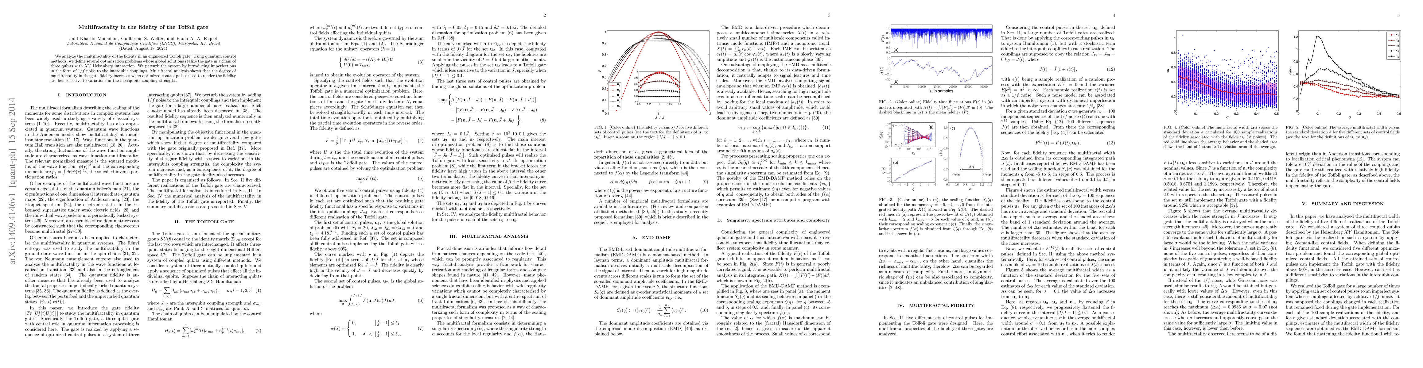 We analyze the multifractality of the fidelity in an engineered Toffoli gate. Using quantum control methods, we define several optimization problems whose global solutions realize the gate in a chain of three qubits with XY Heisenberg interaction. We perturb the system by introducing imperfections in the form of $1/f$ noise to the interqubit couplings. Multifractal analysis shows that the degree of multifractality in the gate fidelity increases when optimized control pulses used to render the fidelity are less sensitive to variations in the interqubits coupling strengths.