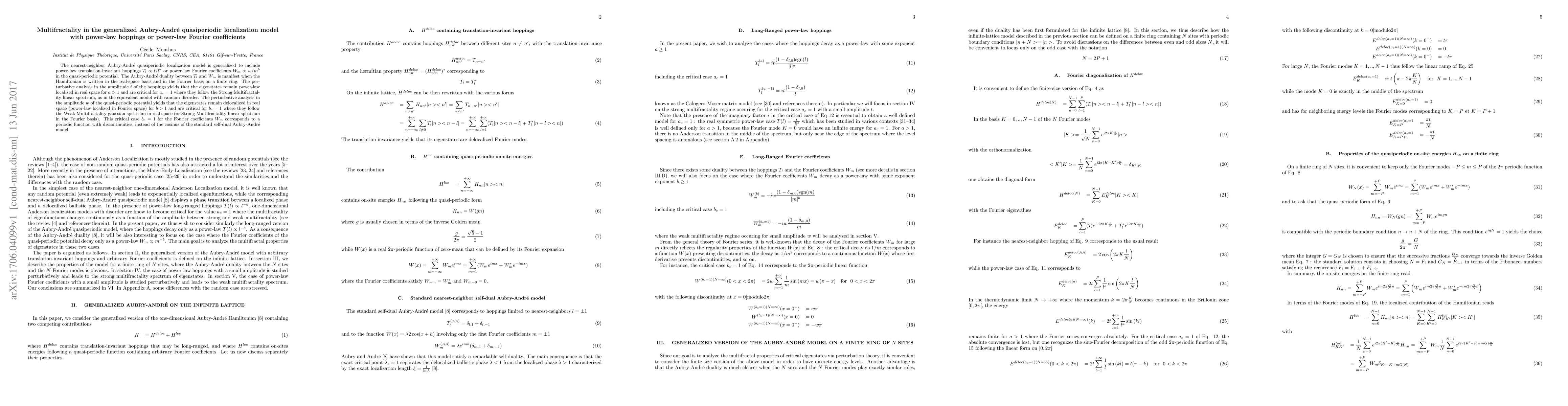 This paper generalizes the Aubry-André quasiperiodic localization model to include power-law hoppings or Fourier coefficients, revealing strong multifractality in eigenstates for critical values of the exponents, and demonstrating duality between real and Fourier space localization behaviors.