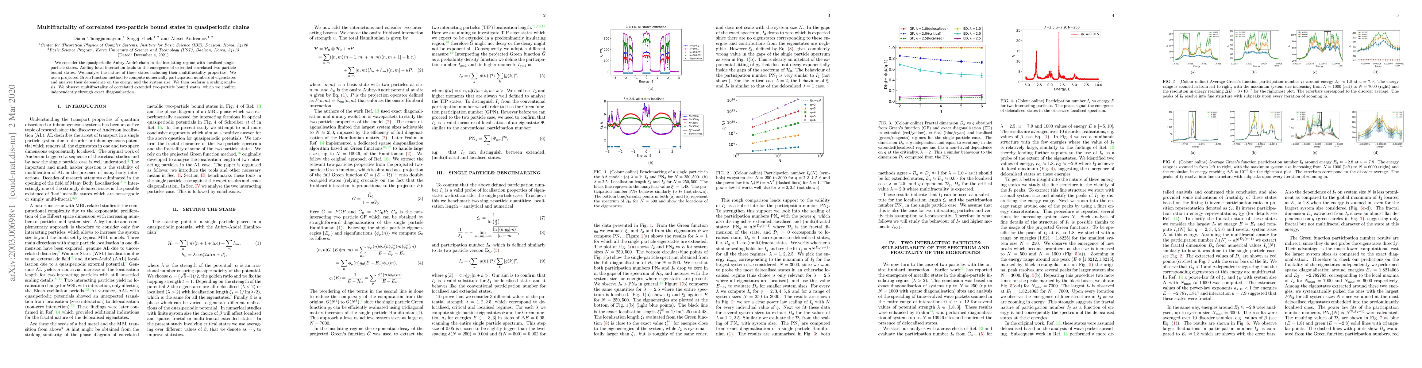 This paper investigates the multifractality of extended two-particle bound states in quasiperiodic Aubry-André chains with local interactions, employing a projected Green function method and exact diagonalisation to confirm the observed multifractality through numerical analysis of participation numbers.