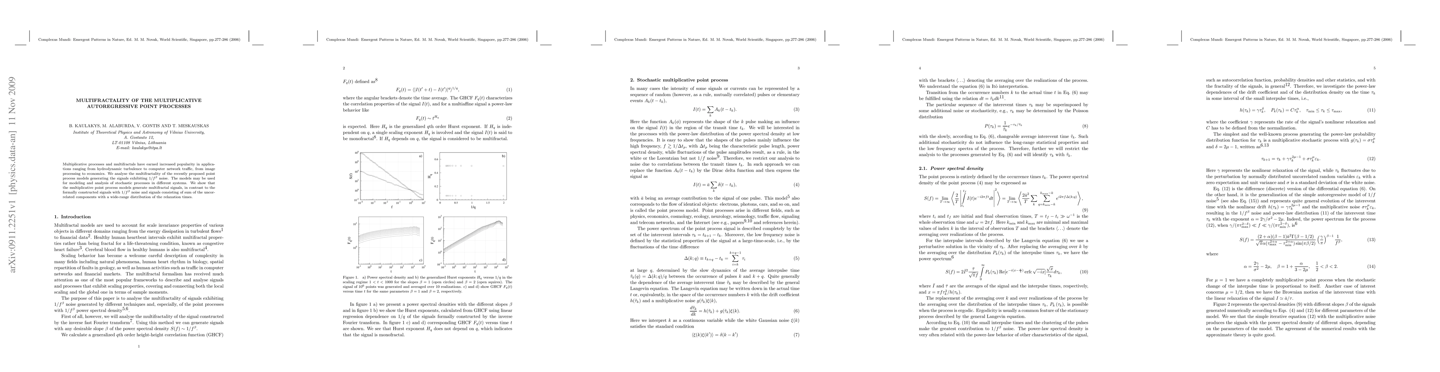This paper investigates the multifractality of recently proposed multiplicative autoregressive point process models, demonstrating that these models generate multifractal signals, unlike constructed 1/f^b noise signals or sums of uncorrelated components with varied relaxation times. The findings enhance the modeling of stochastic processes across various systems.