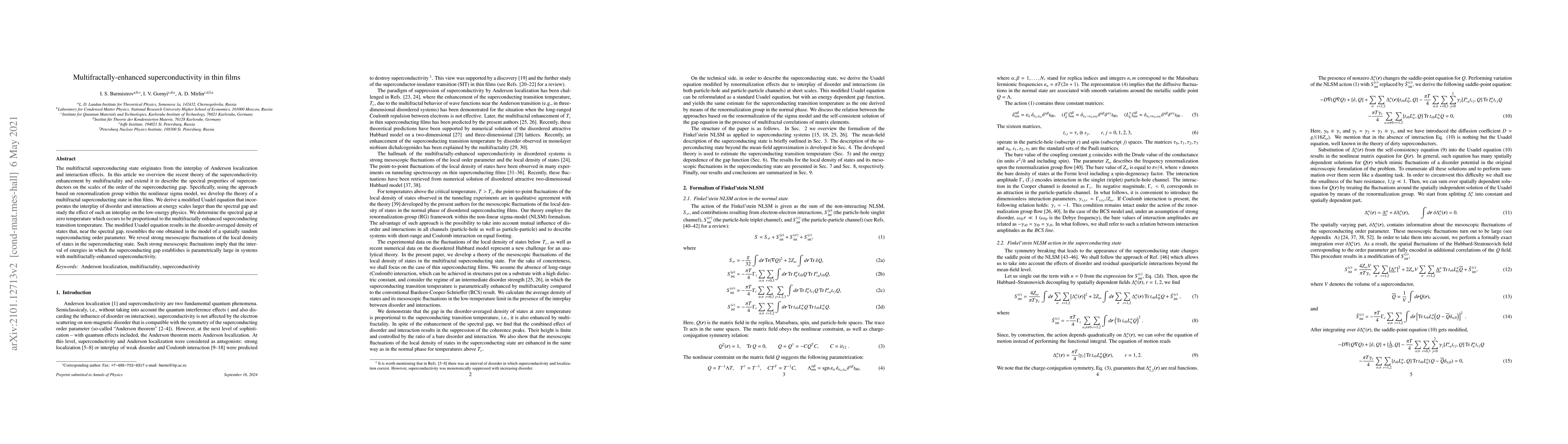 This paper develops a theory for multifractally-enhanced superconductivity in thin films, showing that the interplay of Anderson localization and interaction effects leads to significant spectral properties. The study uses renormalization group methods to derive a modified Usadel equation, revealing strong mesoscopic fluctuations and a large interval for the establishment of the superconducting gap.