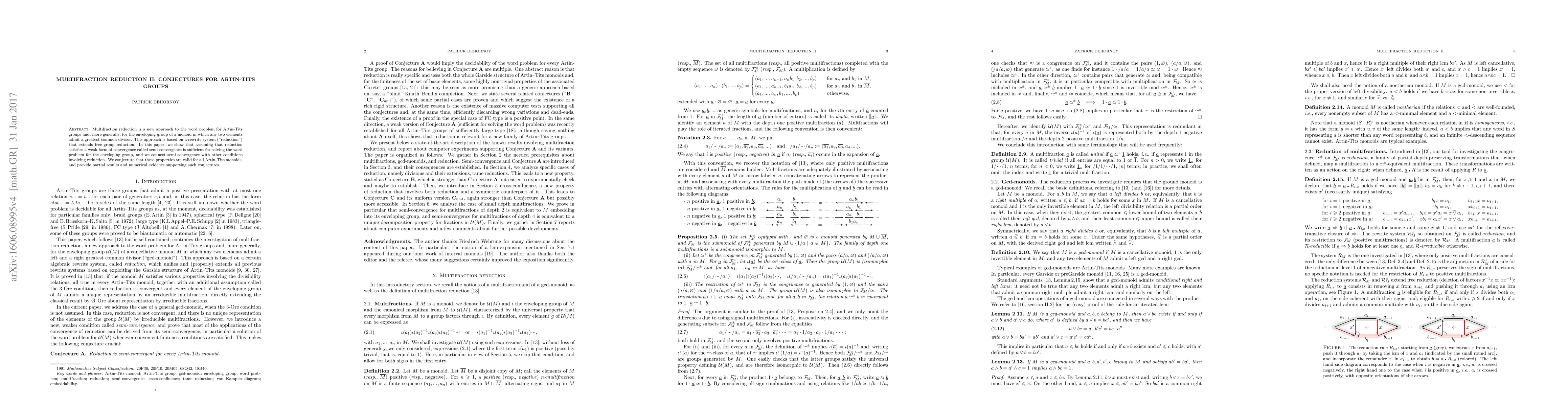 Multifraction reduction is a new approach to the word problem for Artin-Tits groups and, more generally, for the enveloping group of a monoid in which any two elements admit a greatest common divisor. This approach is based on a rewrite system ("reduction") that extends free group reduction. In this paper, we show that assuming that reduction satisfies a weak form of convergence called semi-convergence is sufficient for solving the word problem for the enveloping group, and we connect semi-convergence with other conditions involving reduction. We conjecture that these properties are valid for all Artin-Tits monoids, and provide partial results and numerical evidence supporting such conjectures.