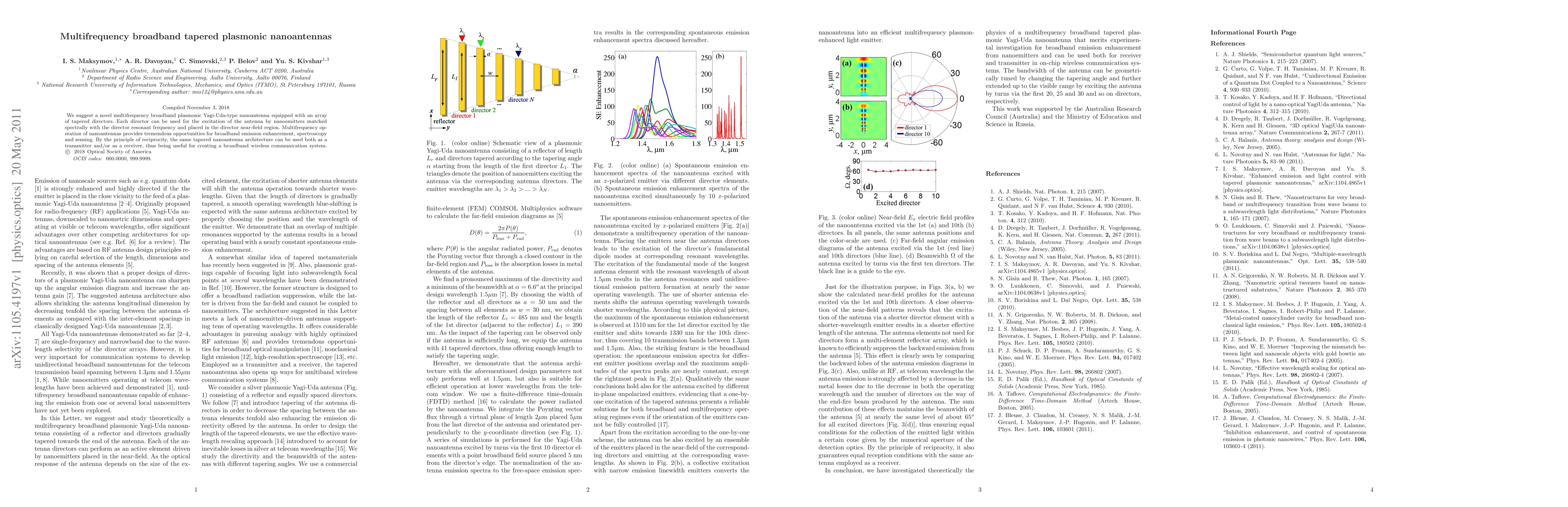 This paper introduces a new multifrequency broadband plasmonic Yagi-Uda-type nanoantenna with tapered directors for enhanced broadband emission, spectroscopy, and sensing. The proposed architecture functions both as a transmitter and receiver, enabling the development of a broadband wireless communication system.