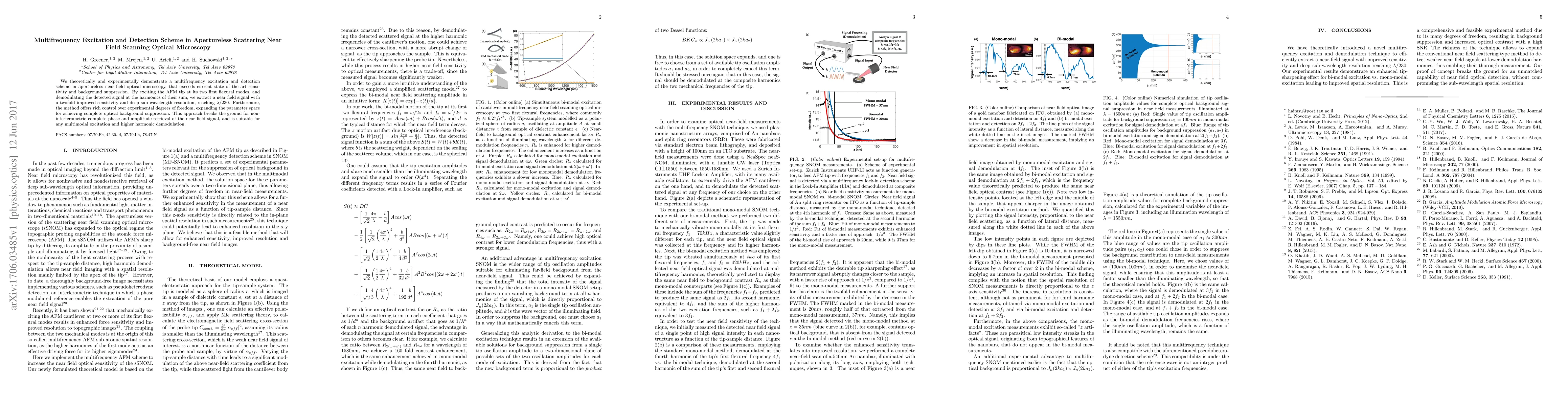 This paper presents a novel multifrequency excitation and detection scheme in apertureless near field optical microscopy, achieving twofold improved sensitivity and deep sub-wavelength resolution. The method utilizes AFM tip flexural modes and higher harmonic demodulation, offering enhanced control over optical background suppression and enabling non-interferometric phase and amplitude retrieval.