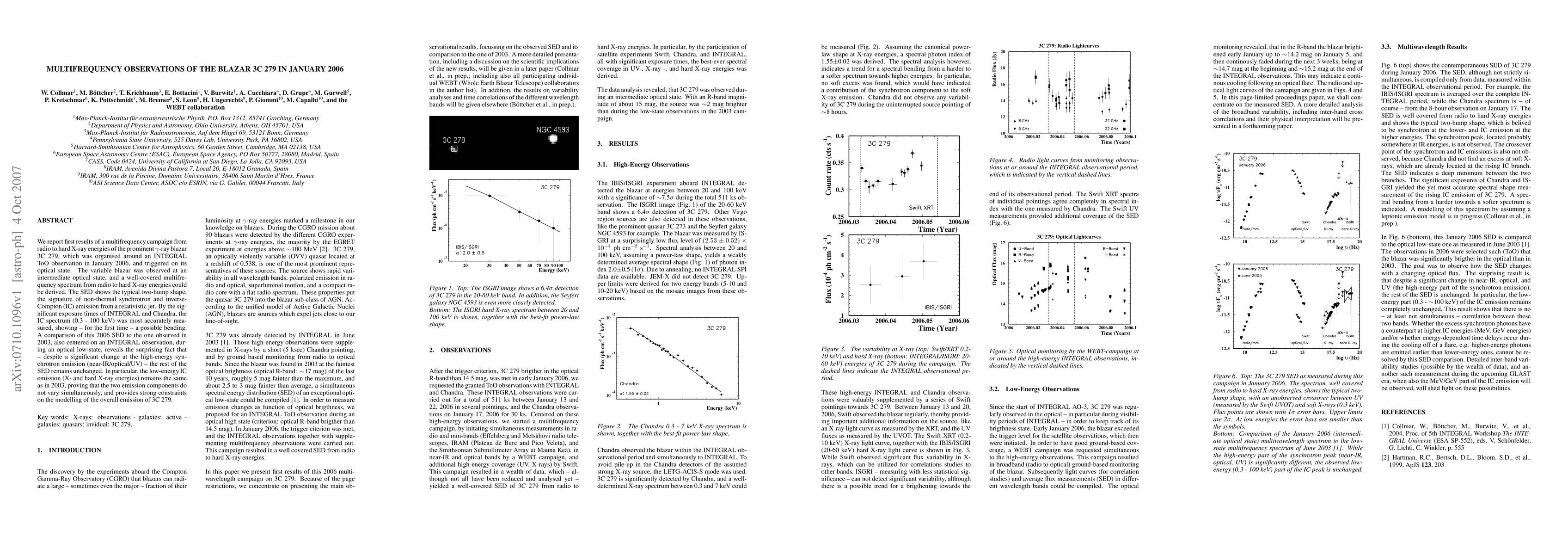 We report first results of a multifrequency campaign from radio to hard X-ray energies of the prominent gamma-ray blazar 3C 279, which was organised around an INTEGRAL ToO observation in January 2006, and triggered on its optical state. The variable blazar was observed at an intermediate optical state, and a well-covered multifrequency spectrum from radio to hard X-ray energies could be derived. The SED shows the typical two-hump shape, the signature of non-thermal synchrotron and inverse-Compton (IC) emission from a relativistic jet. By the significant exposure times of INTEGRAL and Chandra, the IC spectrum (0.3 - 100 keV) was most accurately measured, showing - for the first time - a possible bending. A comparison of this 2006 SED to the one observed in 2003, also centered on an INTEGRAL observation, during an optical low-state, reveals the surprising fact that - despite a significant change at the high-energy synchrotron emission (near-IR/optical/UV) - the rest of the SED remains unchanged. In particular, the low-energy IC emission (X- and hard X-ray energies) remains the same as in 2003, proving that the two emission components do not vary simultaneously, and provides strong constraints on the modelling of the overall emission of 3C 279.