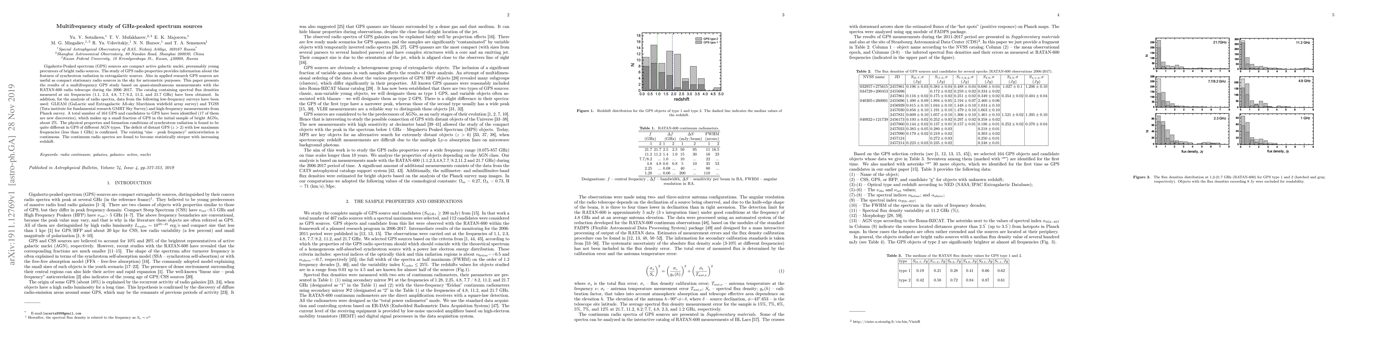 Gigahertz-Peaked spectrum (GPS) sources are compact active galactic nuclei, presumably young precursors of bright radio sources. The study of GPS radio properties provides information about the features of synchrotron radiation in extragalactic sources. Also in applied research GPS sources are useful as compact stationary radio sources in the sky for astrometric purposes. This paper presents the results of a multifrequency GPS study based on quasi-simultaneous measurements with the RATAN-600 radio telescope during the 2006-2017. The catalog containing spectral flux densities measured at six frequencies (1.1, 2.3, 4.8, 7.7/8.2, 11.2, and 21.7 GHz) have been obtained. In addition, for the analysis of radio spectra, data from the following low-frequency surveys have been used: GLEAM (GaLactic and Extragalactic All-sky Murchison widefield array survey) and TGSS (Tata institute for fundamental research GMRT Sky Survey) and high-frequency measurements from Planck survey. A total number of 164 GPS and candidates to GPS have been identified (17 of them are new discoveries), which makes up a small fraction of GPS in the initial sample of bright AGNs, about 2%. The physical properties and formation conditions of synchrotron radiation is found to be quite different in GPS of different AGN types. The deficit of distant GPS ($z > 2$) with low maximum frequencies (less than 1 GHz) is confirmed. The existing 'size - peak frequency' anticorrelation is continuous. The continuum radio spectra are found to become statistically steeper with increasing redshift.
