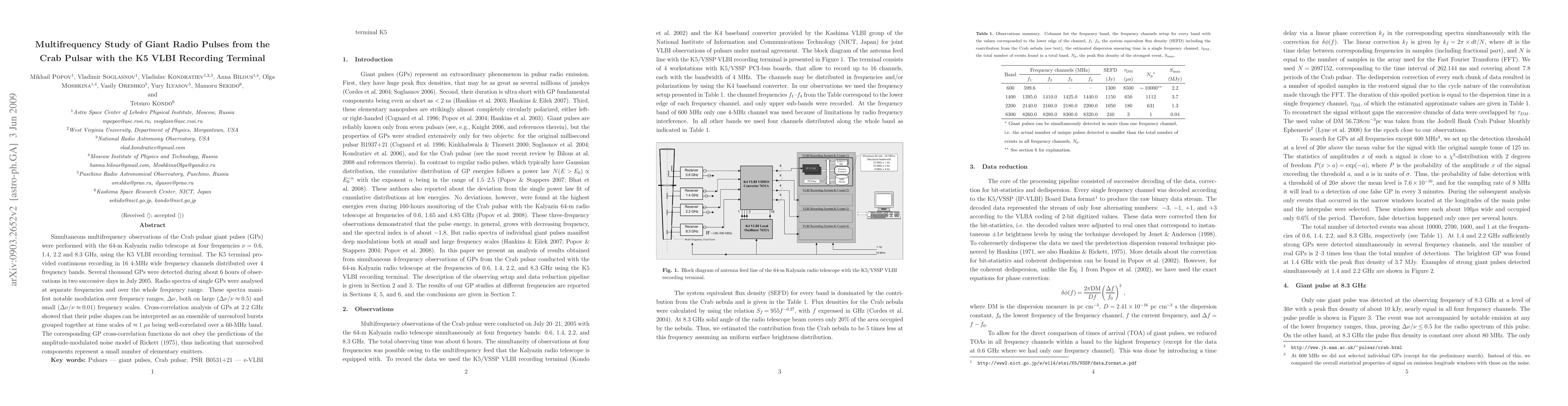 Simultaneous multifrequency observations of the Crab pulsar giant pulses (GPs) were performed with the 64-m Kalyazin radio telescope at four frequencies 0.6, 1.4, 2.2 and 8.3 GHz using the K5 VLBI recording terminal. The K5 terminal provided continuous recording in 16 4-MHz wide frequency channels distributed over 4 frequency bands. Several thousands of GPs were detected during about 6 hours of observations in two successive days in July 2005. Radio spectra of single GPs were analysed at separate frequencies and over whole frequency range. These spectra manifest notable modulation over frequency ranges, $\Delta\nu$, both on large ($\Delta\nu/\nu\approx 0.5$) and small ($\Delta\nu/\nu\approx 0.01$) frequency scales. Cross-correlation analysis of GPs at 2.2 GHz showed that their pulse shapes can be interpreted as an ensemble of unresolved bursts grouped together at time scales of $\approx 1$ mcs being well-correlated over a 60-MHz band. The corresponding GP cross-correlation functions do not obey the predictions of the amplitude-modulated noise model of Rickett (1975), thus indicating that unresolved components represent a small number of elementary emitters.