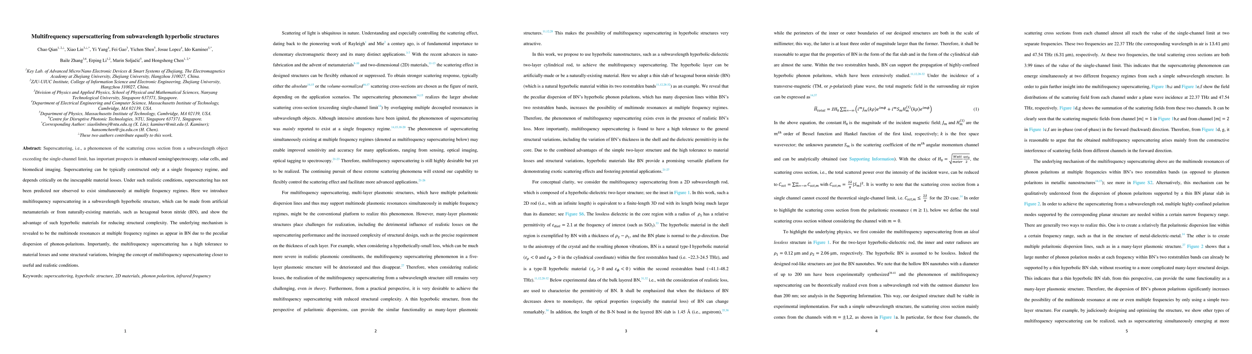 This paper introduces multifrequency superscattering in subwavelength hyperbolic structures, which can operate across multiple frequency regimes despite material losses. The study highlights the use of hyperbolic materials like hexagonal boron nitride for achieving this phenomenon, revealing the role of multimode resonances in phonon-polaritons.