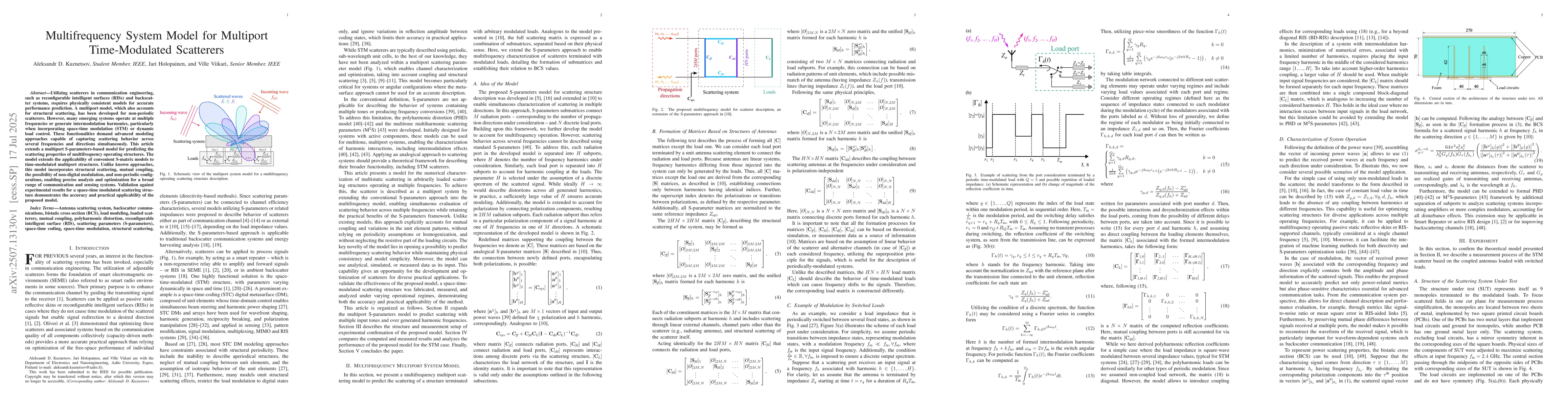 Utilizing scatterers in communication engineering, such as reconfigurable intelligent surfaces (RISs) and backscatter systems, requires physically consistent models for accurate performance prediction. A multiport model, which also accounts for structural scattering, has been developed for non-periodic scatterers. However, many emerging systems operate at multiple frequencies or generate intermodulation harmonics, particularly when incorporating space-time modulation (STM) or dynamic load control. These functionalities demand advanced modeling approaches capable of capturing scattering behavior across several frequencies and directions simultaneously. This article extends a multiport S-parameters-based model for predicting the scattering properties of multifrequency operating structures. The model extends the applicability of convenient S-matrix models to time-modulated multiport structures. Unlike known approaches, this model incorporates structural scattering, mutual coupling, the possibility of non-digital modulation, and non-periodic configurations, enabling precise analysis and optimization for a broad range of communication and sensing systems. Validation against experimental results for a space-time modulated scattering structure demonstrates the accuracy and practical applicability of the proposed model.