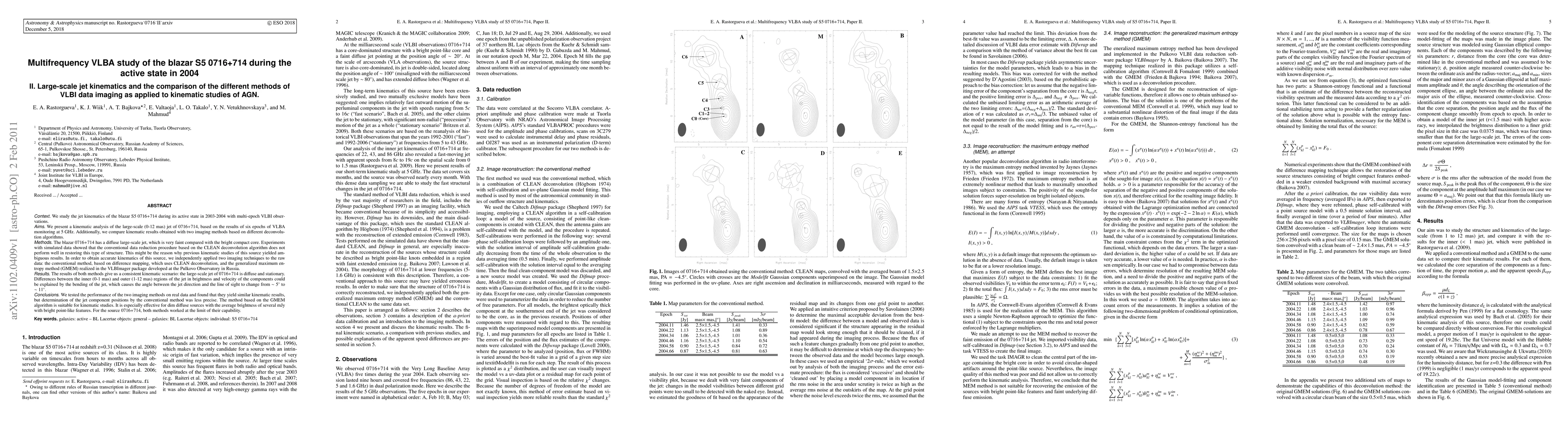 We study the jet kinematics of the blazar S5 0716+714 during its active state in 2003-2004 with multi-epoch VLBI observations. Aims. We present a kinematic analysis of the large-scale (0-12 mas) jet of 0716+714, based on the results of six epochs of VLBA monitoring at 5 GHz. Additionally, we compare kinematic results obtained with two imaging methods based on different deconvolution algorithms. The blazar 0716+714 has a diffuse large-scale jet and a very faint bright compact core. Experiments with simulated data showed that the conventional data reduction procedure based on the CLEAN deconvolution algorithm does not perform well in restoring this type of structure. This might be the reason why previous kinematic studies of this source yielded ambiguous results. In order to obtain accurate kinematics of this source, we independently applied two imaging techniques to the raw data: the conventional method, based on difference mapping, which uses CLEAN deconvolution, and the generalized maximum entropy method (GMEM) realized in the VLBImager package developed at the Pulkovo Observatory in Russia. The results of both methods give us a consistent kinematic scenario: the large-scale jet of 0716+714 is diffuse and stationary. Differences between the inner (0-1 mas) and outer (1-12 mas) regions of the jet in brightness and velocity of the components could be explained by the bending of the jet, which causes the angle between the jet direction and the line of sight to change from ~5 deg to ~11 deg. For the source 0716+714 both methods worked at the limit of their capability.