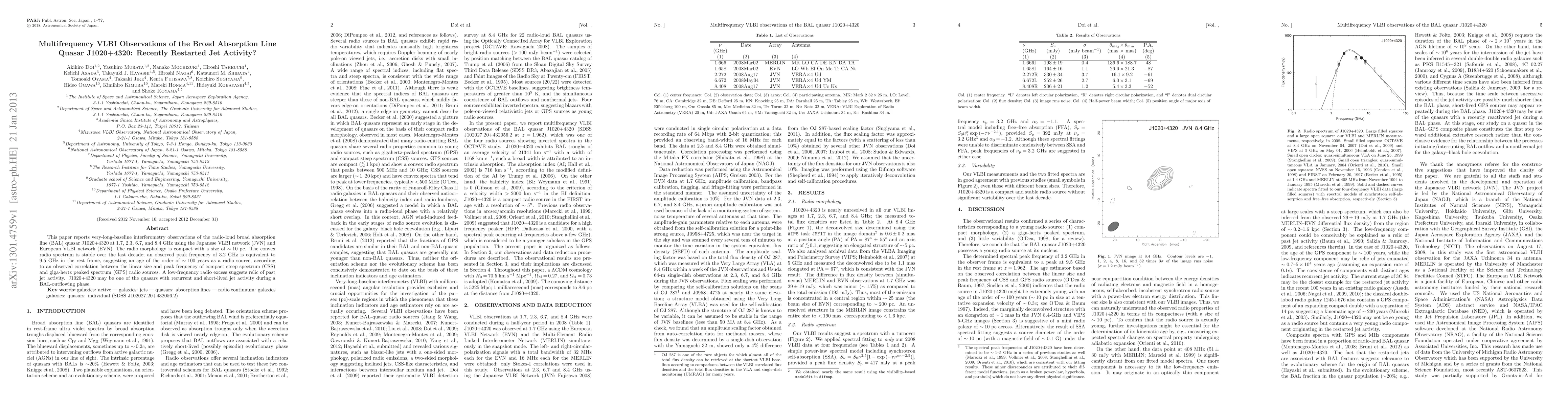 This paper reports very-long-baseline interferometry observations of the radio-loud broad absorption line (BAL) quasar J1020+4320 at 1.7, 2.3, 6.7, and 8.4 GHz using the Japanese VLBI network (JVN) and European VLBI network (EVN). The radio morphology is compact with a size of ~10 pc. The convex radio spectrum is stable over the last decade; an observed peak frequency of 3.2 GHz is equivalent to 9.5 GHz in the rest frame, suggesting an age of the order of ~100 years as a radio source, according to an observed correlation between linear size and peak frequency of compact steep spectrum (CSS) and giga-hertz peaked spectrum (GPS) radio sources. A low-frequency radio excess suggests relic of past jet activity. J1020+4320 may be one of the quasars with recurrent and short-lived jet activity during a BAL-outflowing phase.