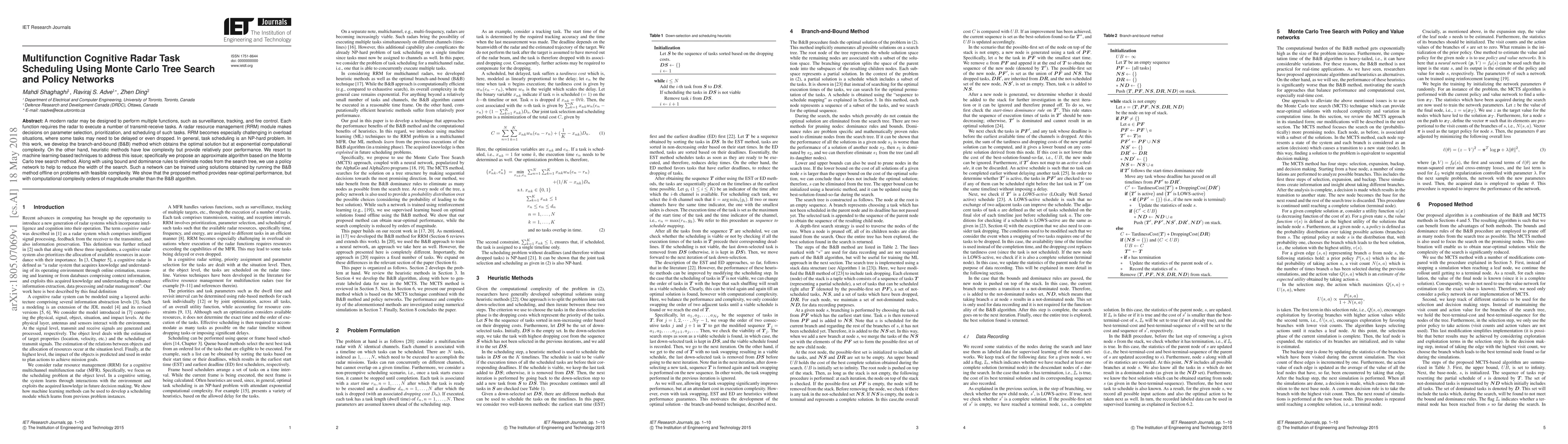 A modern radar may be designed to perform multiple functions, such as surveillance, tracking, and fire control. Each function requires the radar to execute a number of transmit-receive tasks. A radar resource management (RRM) module makes decisions on parameter selection, prioritization, and scheduling of such tasks. RRM becomes especially challenging in overload situations, where some tasks may need to be delayed or even dropped. In general, task scheduling is an NP-hard problem. In this work, we develop the branch-and-bound (B&B) method which obtains the optimal solution but at exponential computational complexity. On the other hand, heuristic methods have low complexity but provide relatively poor performance. We resort to machine learning-based techniques to address this issue; specifically we propose an approximate algorithm based on the Monte Carlo tree search method. Along with using bound and dominance rules to eliminate nodes from the search tree, we use a policy network to help to reduce the width of the search. Such a network can be trained using solutions obtained by running the B&B method offline on problems with feasible complexity. We show that the proposed method provides near-optimal performance, but with computational complexity orders of magnitude smaller than the B&B algorithm.