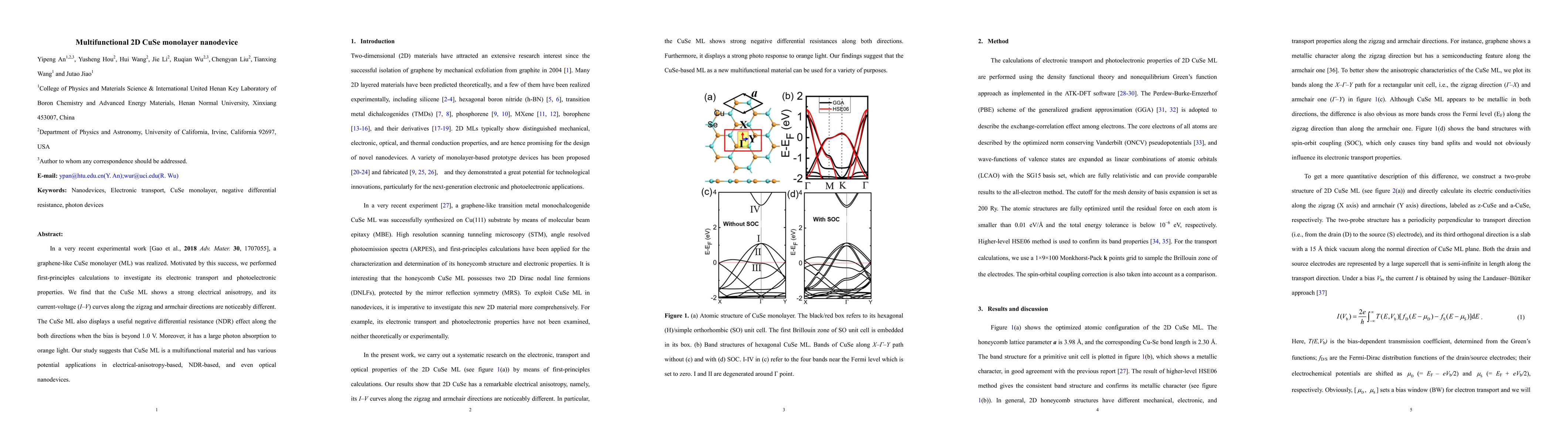A graphene-like CuSe monolayer demonstrates strong electrical anisotropy and a negative differential resistance effect, along with significant photon absorption for orange light, suggesting its potential in multifunctional electronic and optical nanodevices.