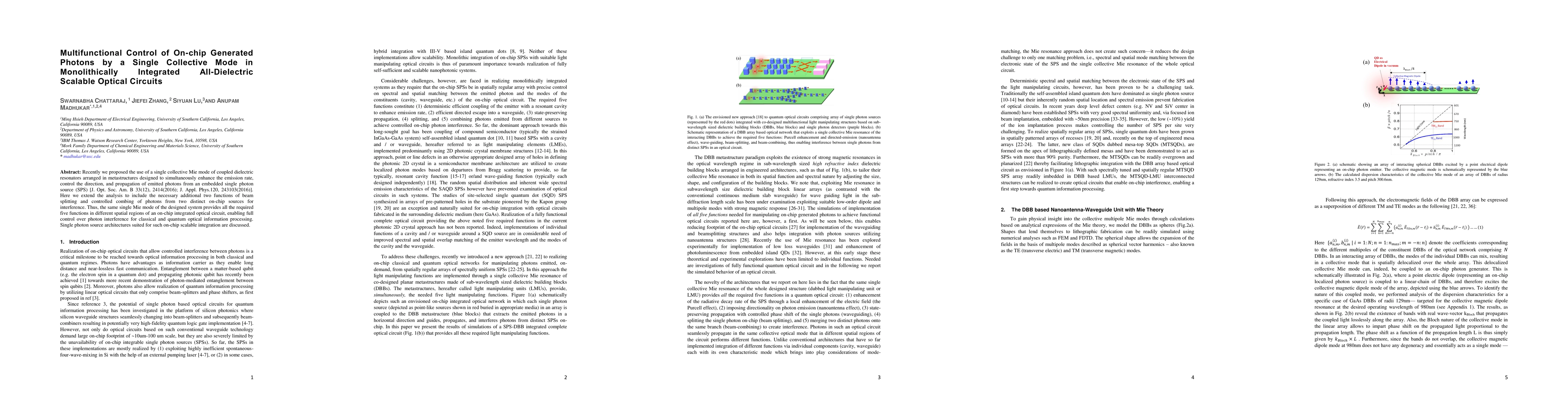 Recently we proposed the use of a single collective Mie mode of coupled dielectric resonators arranged in metastructures designed to simultaneously enhance the emission rate, control the direction, and propagation of emitted photons from an embedded single photon source (SPS) [J. Opt. Soc. Am. B 33(12), 2414(2016); J. Appl. Phys.120, 243103(2016)]. Here we extend the analysis to include the necessary additional two functions of beam splitting and controlled combing of photons from two distinct on-chip sources for interference. Thus, the same single Mie mode of the designed system provides all the required five functions in different spatial regions of an on-chip integrated optical circuit, enabling full control over photon interference for classical and quantum optical information processing. Single photon source architectures suited for such on-chip scalable integration are discussed.