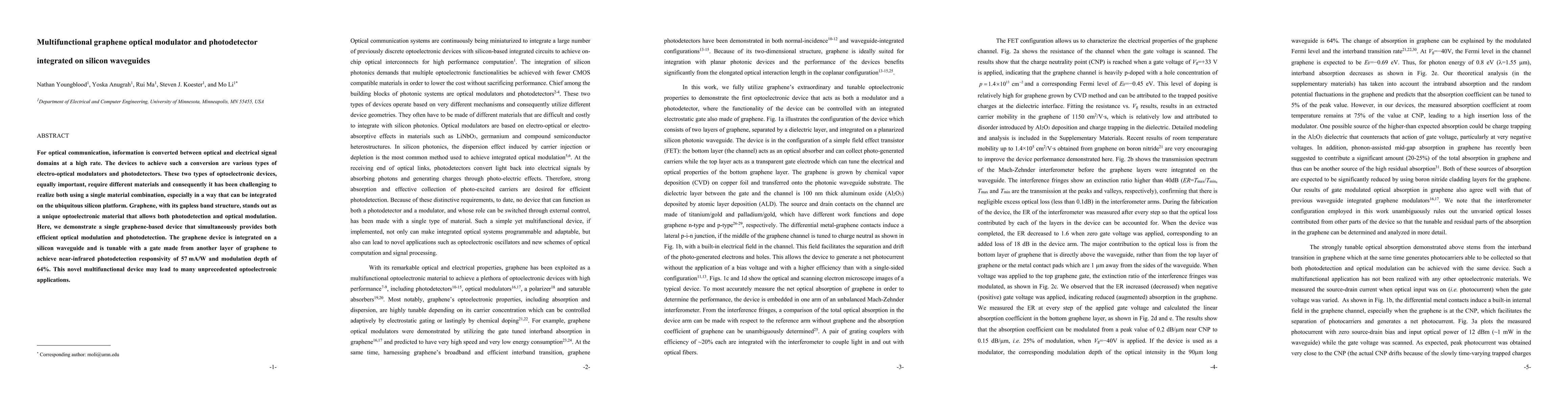 This paper presents a graphene-based device integrated on silicon waveguides that simultaneously achieves efficient optical modulation and near-infrared photodetection, demonstrating a responsivity of 57 mA/W and a modulation depth of 64%. This multifunctional device could revolutionize optoelectronic applications.