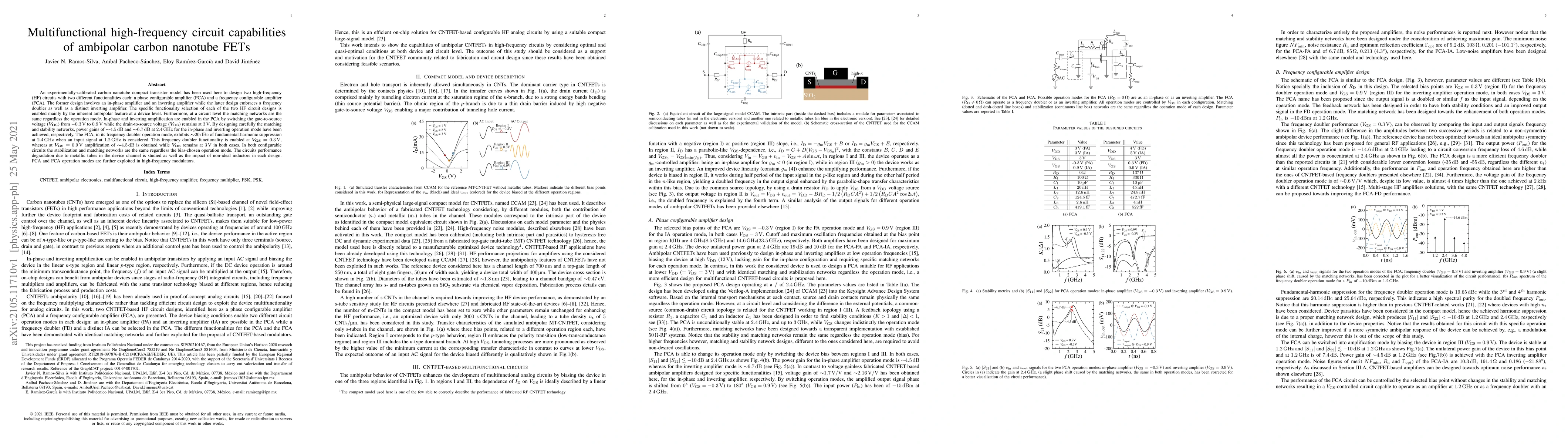 An experimentally-calibrated carbon nanotube compact transistor model has been used here to design two high-frequency (HF) circuits with two different functionalities each: a phase configurable amplifier (PCA) and a frequency configurable amplifier (FCA). The former design involves an in-phase amplifier and an inverting amplifier while the latter design embraces a frequency doubler as well as a distinct inverting amplifier. The specific functionality selection of each of the two HF circuit designs is enabled mainly by the inherent ambipolar feature at a device level. Furthermore, at a circuit level the matching networks are the same regardless the operation mode. In-phase and inverting amplification are enabled in the PCA by switching the gate-to-source voltage (VGS) from -0.3 V to 0.9 V while the drain-to-source voltage (VDS) remains at 3 V. By designing carefully the matching and stability networks, power gains of 4.5 dB and 6.7 dB at 2.4 GHz for the in-phase and inverting operation mode have been achieved, respectively. The FCA, in its frequency doubler operation mode, exhibits 20 dBc of fundamental-harmonic suppression at 2.4 GHz when an input signal at 1.2 GHz is considered. This frequency doubler functionality is enabled at VGS=0.3 V, whereas at VGS=0.9 V amplification of 4.5 dB is obtained while VDS remains at 3 V in both cases. In both configurable circuits the stabilization and matching networks are the same regardless the bias-chosen operation mode. The circuits performance degradation due to metallic tubes in the device channel is studied as well as the impact of non-ideal inductors in each design. PCA and FCA operation modes are further exploited in high-frequency modulators.