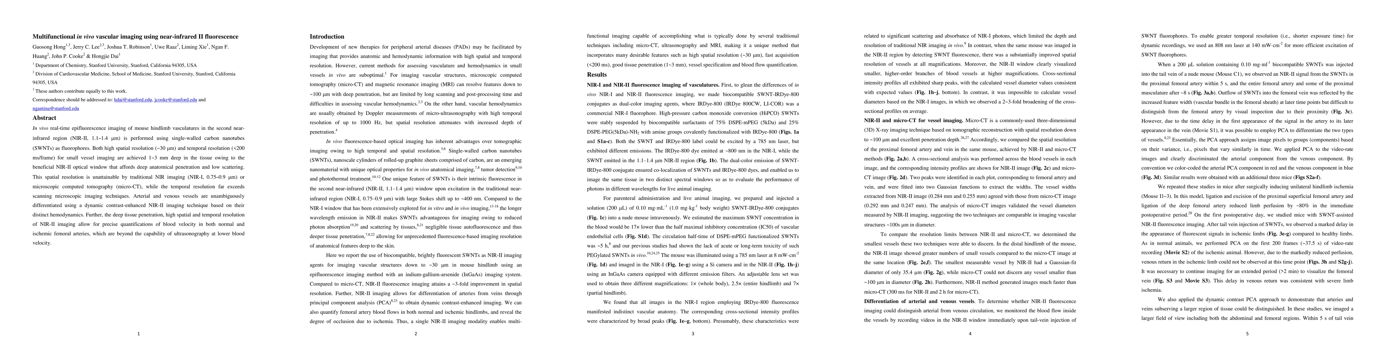 This paper demonstrates high-resolution, real-time in vivo vascular imaging of mouse hindlimbs using single-walled carbon nanotubes in the NIR-II window, achieving superior spatial and temporal resolutions compared to traditional NIR and micro-CT, enabling precise differentiation of arterial and venous vessels and quantification of blood flow.