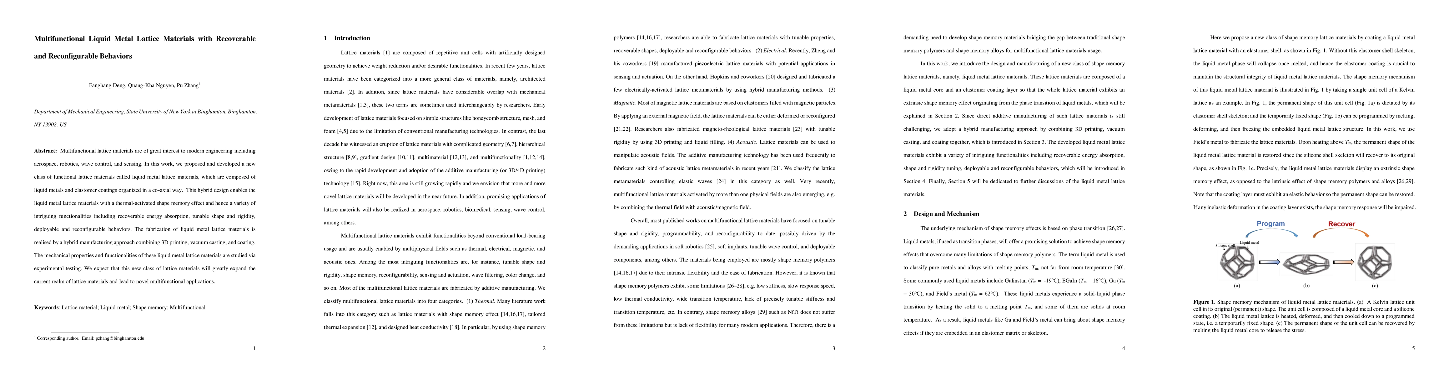 This research introduces a novel class of liquid metal lattice materials with tunable shape and rigidity, deployable features, and recoverable energy absorption capabilities, developed using a hybrid manufacturing approach. These materials, with their shape memory effect and multifunctional behaviors, hold promise for advanced applications in aerospace, robotics, and wave control.