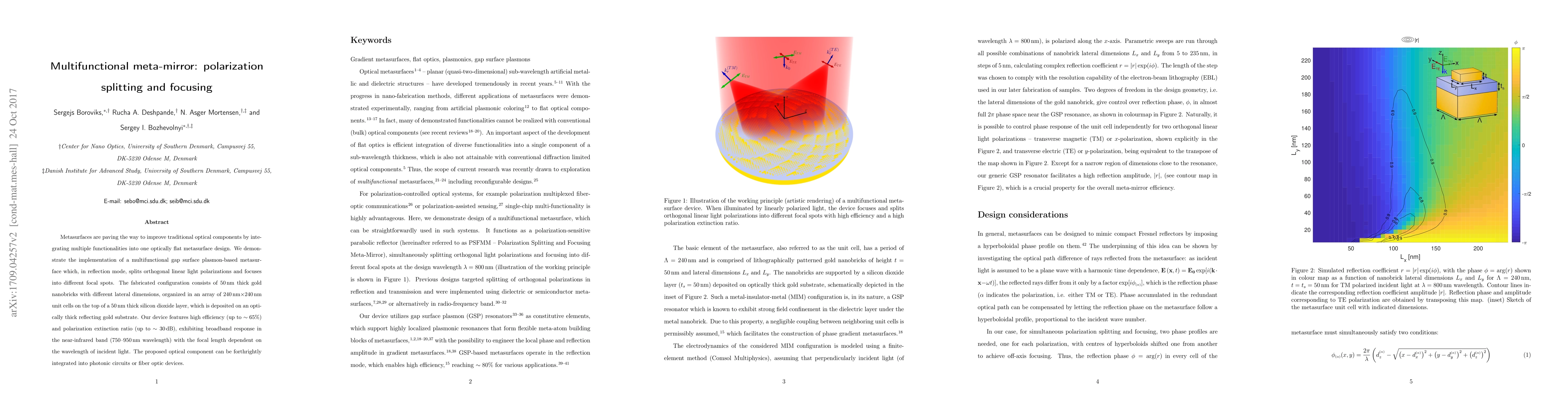 Metasurfaces are paving the way to improve traditional optical components by integrating multiple functionalities into one optically flat metasurface design. We demonstrate the implementation of a multifunctional gap surface plasmon-based metasurface which, in reflection mode, splits orthogonal linear light polarizations and focuses into different focal spots. The fabricated configuration consists of 50 nm thick gold nanobricks with different lateral dimensions, organized in an array of 240 nm x 240 nm unit cells on the top of a 50 nm thick silicon dioxide layer, which is deposited on an optically thick reflecting gold substrate. Our device features high efficiency (up to ~65%) and polarization extinction ratio (up to ~30 dB), exhibiting broadband response in the near-infrared band (750-950 nm wavelength) with the focal length dependent on the wavelength of incident light. The proposed optical component can be forthrightly integrated into photonic circuits or fiber optic devices.