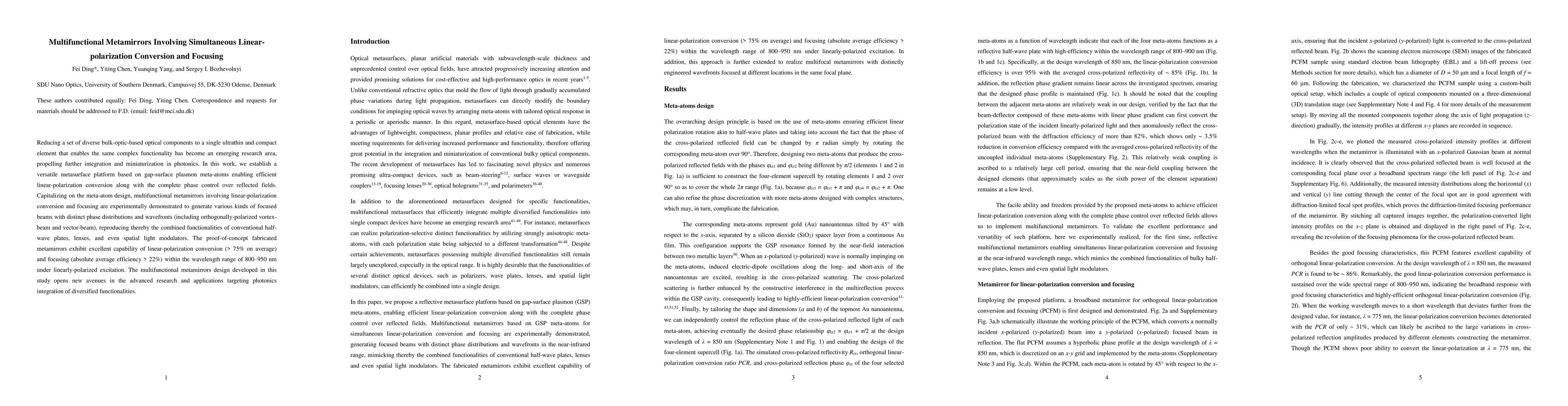 This research develops multifunctional metamirrors using gap-surface plasmon meta-atoms for simultaneous linear-polarization conversion and focusing. The metamirrors demonstrate the combined functionalities of half-wave plates, lenses, and spatial light modulators, achieving these effects in an ultrathin, compact design.