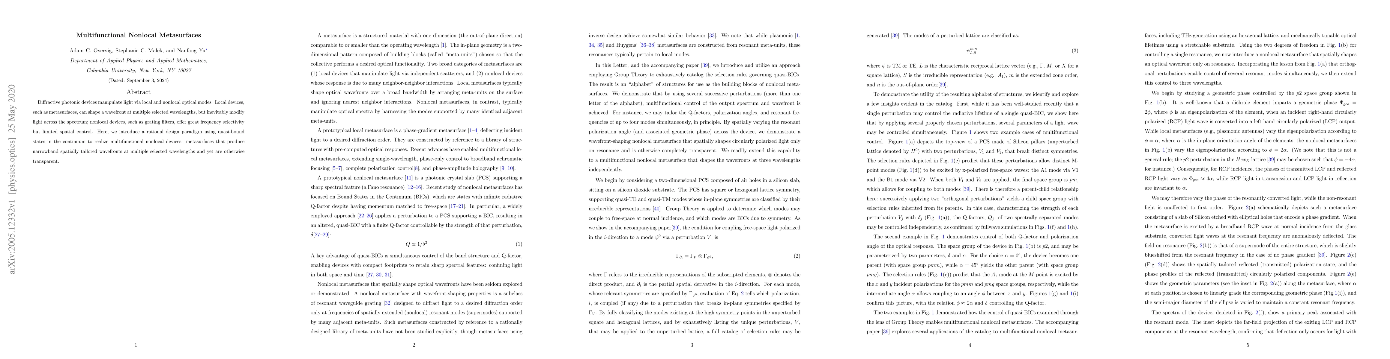 Diffractive photonic devices manipulate light via local and nonlocal optical modes. Local devices, such as metasurfaces, can shape a wavefront at multiple selected wavelengths, but inevitably modify light across the spectrum; nonlocal devices, such as grating filters, offer great frequency selectivity but limited spatial control. Here, we introduce a rational design paradigm using quasi-bound states in the continuum to realize multifunctional nonlocal devices: metasurfaces that produce narrowband spatially tailored wavefronts at multiple selected wavelengths and yet are otherwise transparent.