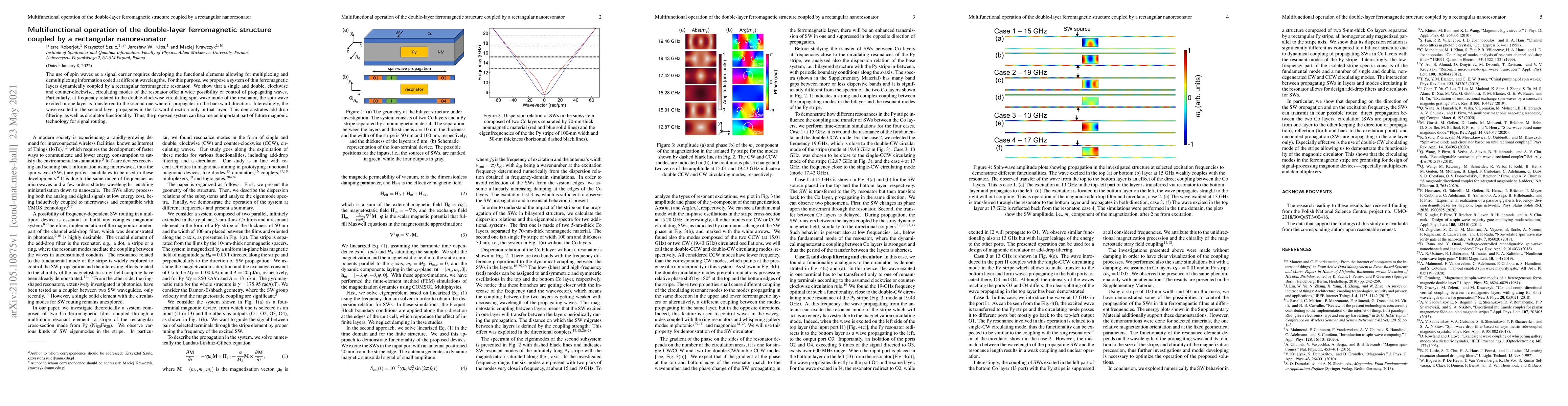 The use of spin waves as a signal carrier requires developing the functional elements allowing for multiplexing and demultiplexing information coded at different wavelengths. For this purpose, we propose a system of thin ferromagnetic layers dynamically coupled by a rectangular ferromagnetic resonator. We show that a single and double, clockwise and counter-clockwise, circulating modes of the resonator offer a wide possibility of control of propagating waves. Particularly, at frequency related to the double-clockwise circulating spin-wave mode of the resonator, the spin wave excited in one layer is transferred to the second one where it propagates in the backward direction. Interestingly, the wave excited in the second layer propagates in the forward direction only in that layer. This demonstrates add-drop filtering, as well as circulator functionality. Thus, the proposed system can become an important part of future magnonic technology for signal routing.