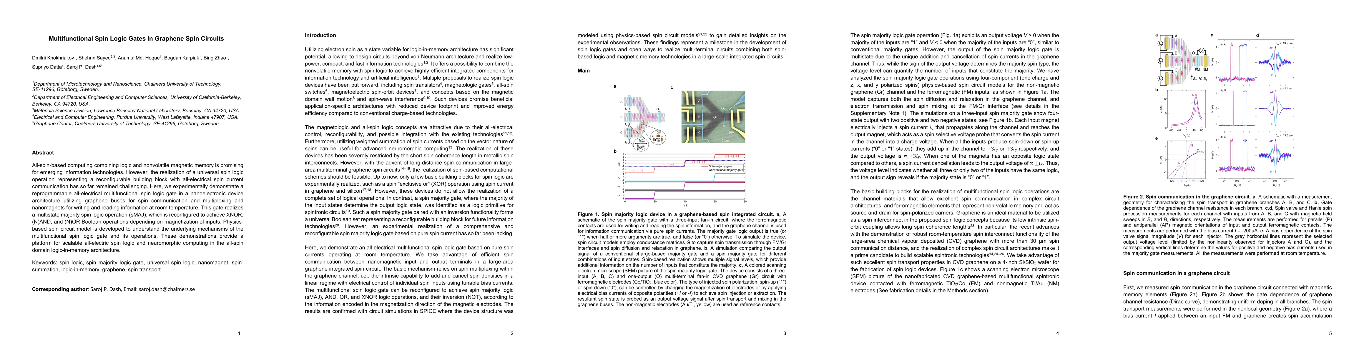 This research demonstrates a reprogrammable, all-electrical multifunctional spin logic gate using graphene and nanomagnets at room temperature, capable of performing XNOR, NAND, and NOR operations. The physics-based spin circuit model elucidates the mechanisms behind this gate, paving the way for scalable all-electric spin logic and neuromorphic computing.