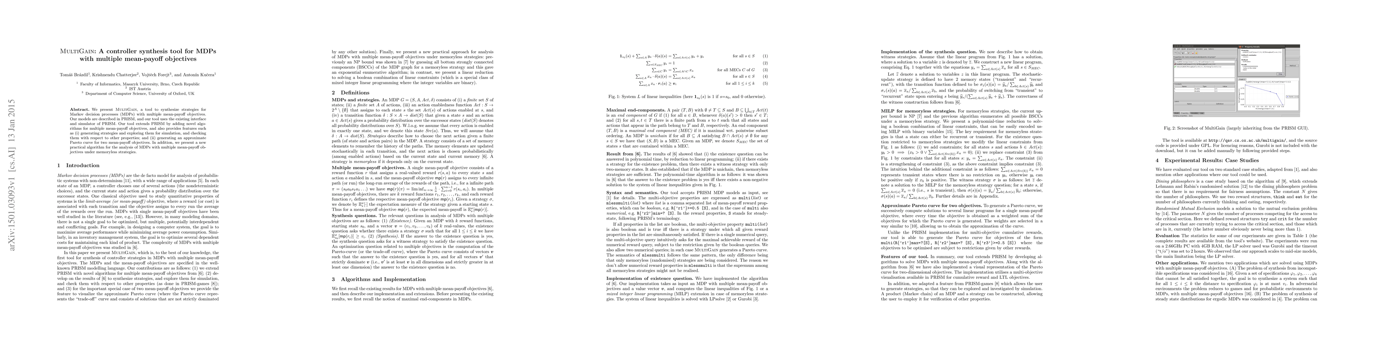 MultiGain is a tool for synthesizing strategies in Markov decision processes (MDPs) with multiple mean-payoff objectives, extending PRISM with novel algorithms and features for strategy generation, simulation, and analysis. It also introduces an approximate Pareto curve for evaluating trade-offs between two objectives.