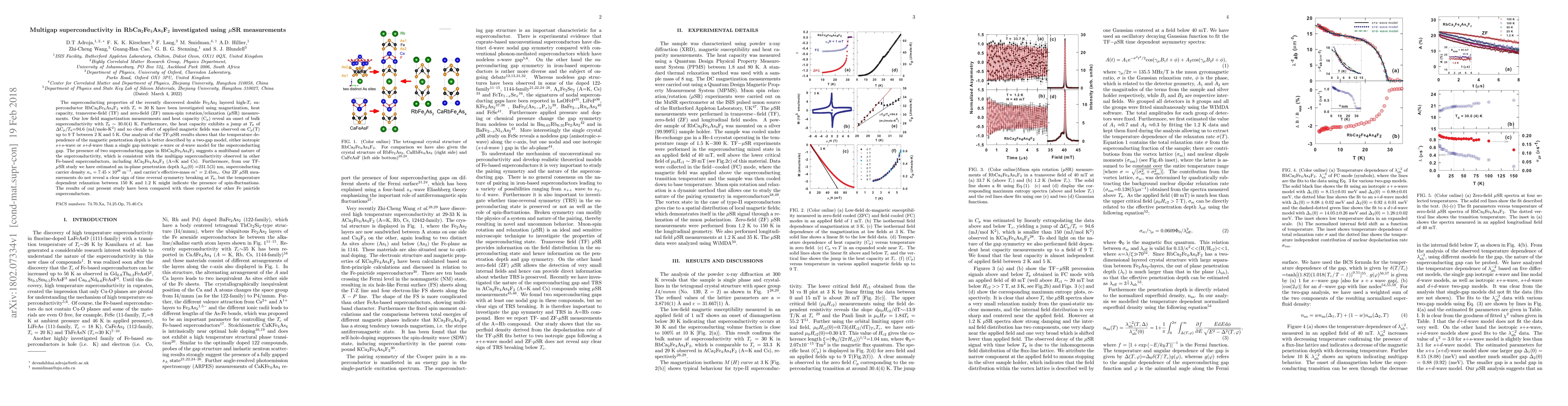 This paper investigates the multigap superconductivity in RbCa$_2$Fe$_4$As$_4$F$_2$ using $\mu$SR, magnetization, and heat capacity measurements, revealing a two-gap superconducting model and a multiband nature consistent with other Fe-based superconductors.