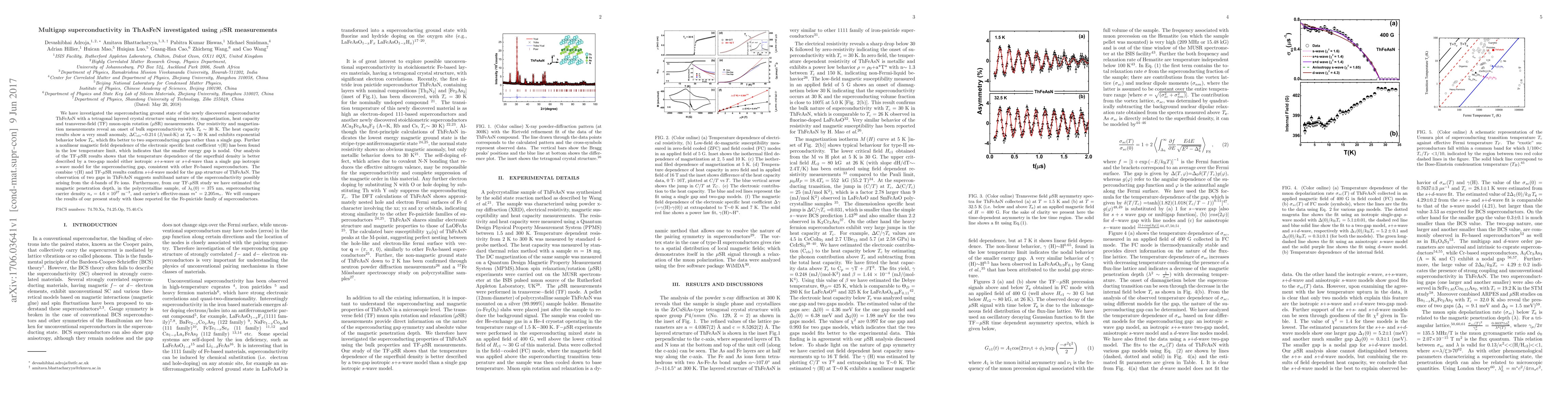 This study investigates the superconducting properties of ThFeAsN using resistivity, magnetization, heat capacity, and $\mu$SR measurements, revealing a critical temperature of 30 K and suggesting a two-gap superconductivity model. The results support an $s$+$d$-wave pairing mechanism and indicate a multiband nature of superconductivity.