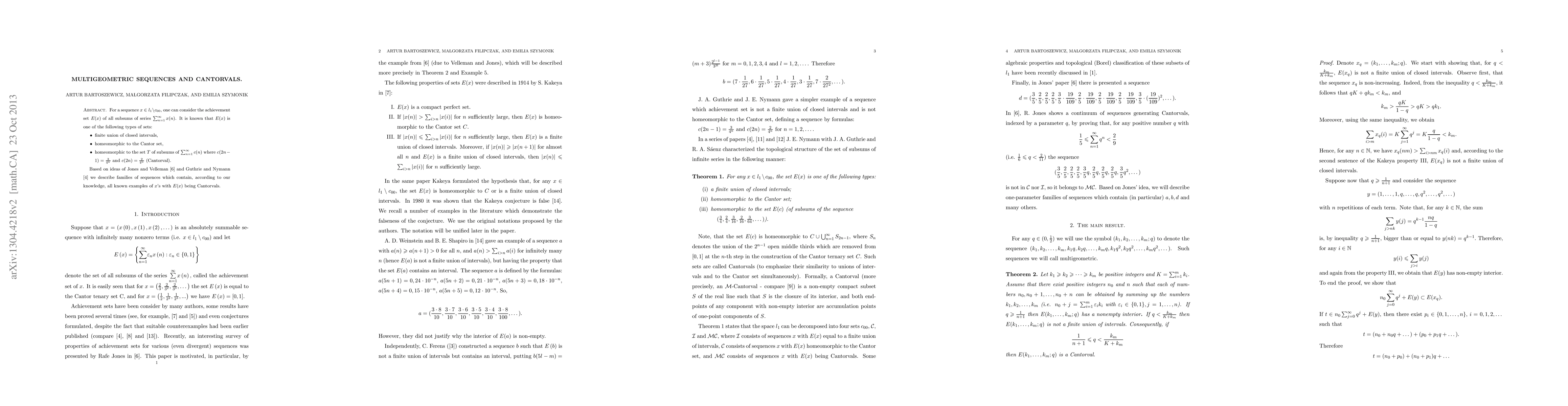 This paper explores multigeometric sequences within $l_1$ excluding finite sequences, focusing on their achievement sets $E(x)$ of subsums. It identifies three types of $E(x)$ sets: finite unions of intervals, homeomorphic to the Cantor set, or homeomorphic to Cantorvals, a specific type defined by a particular sequence. The study builds on previous work to describe families of sequences that exemplify Cantorvals.