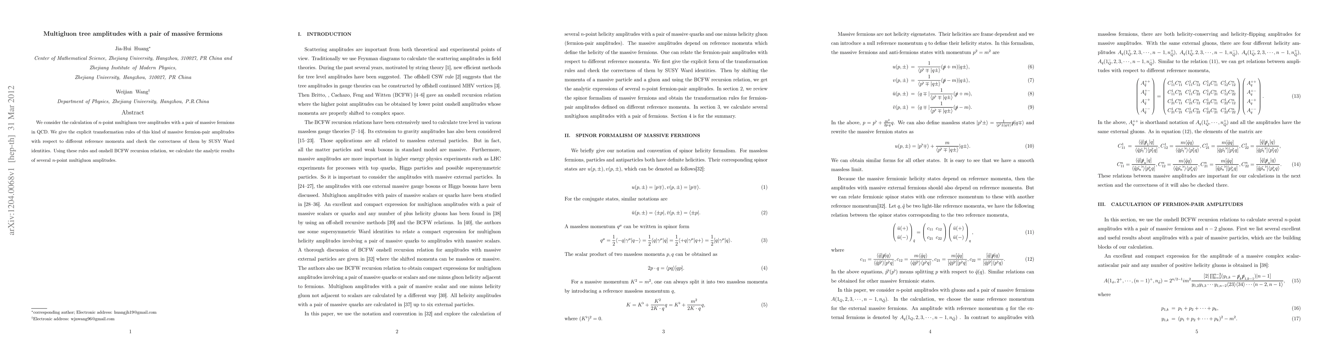 We consider the calculation of n-point multigluon tree amplitudes with a pair of massive fermions in QCD. We give the explicit transformation rules of this kind of massive fermion-pair amplitudes with respect to different reference momenta and check the correctness of them by SUSY Ward identities. Using these rules and onshell BCFW recursion relation, we calculate the analytic results of several n-point multigluon amplitudes.
