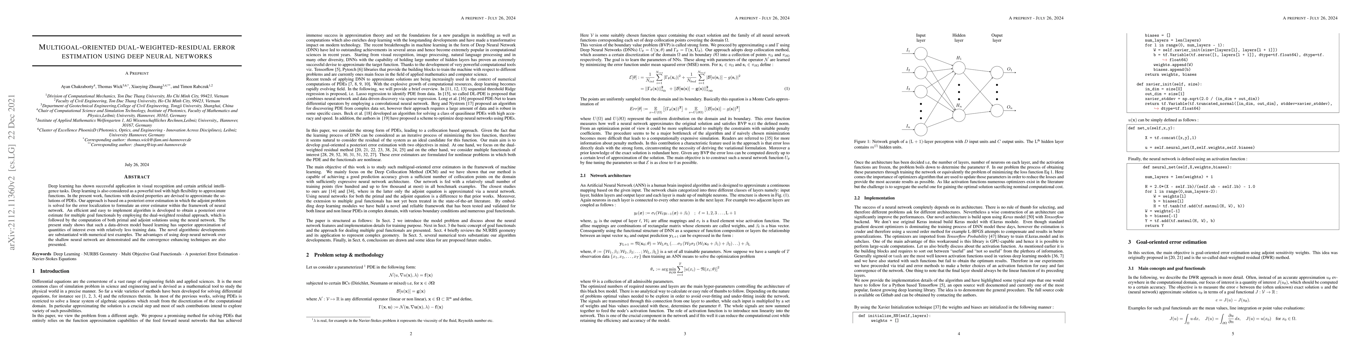 Deep learning has shown successful application in visual recognition and certain artificial intelligence tasks. Deep learning is also considered as a powerful tool with high flexibility to approximate functions. In the present work, functions with desired properties are devised to approximate the solutions of PDEs. Our approach is based on a posteriori error estimation in which the adjoint problem is solved for the error localization to formulate an error estimator within the framework of neural network. An efficient and easy to implement algorithm is developed to obtain a posteriori error estimate for multiple goal functionals by employing the dual-weighted residual approach, which is followed by the computation of both primal and adjoint solutions using the neural network. The present study shows that such a data-driven model based learning has superior approximation of quantities of interest even with relatively less training data. The novel algorithmic developments are substantiated with numerical test examples. The advantages of using deep neural network over the shallow neural network are demonstrated and the convergence enhancing techniques are also presented