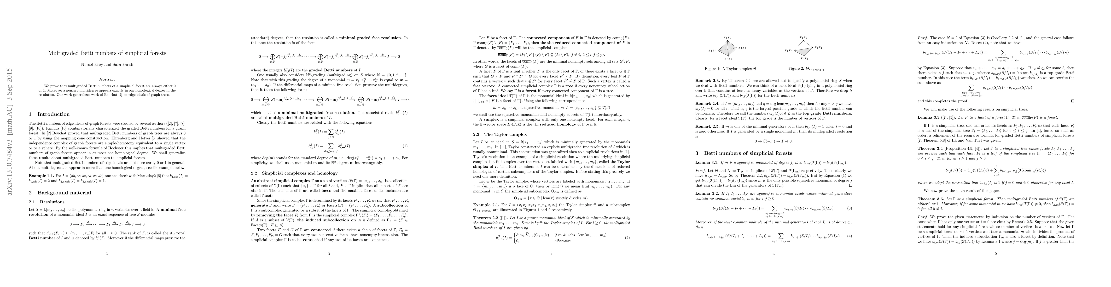 This paper proves that the multigraded Betti numbers for simplicial forests are either 0 or 1, with nonzero multidegrees appearing uniquely at one homological degree in the resolution, extending Bouchat's results on edge ideals of graph forests.